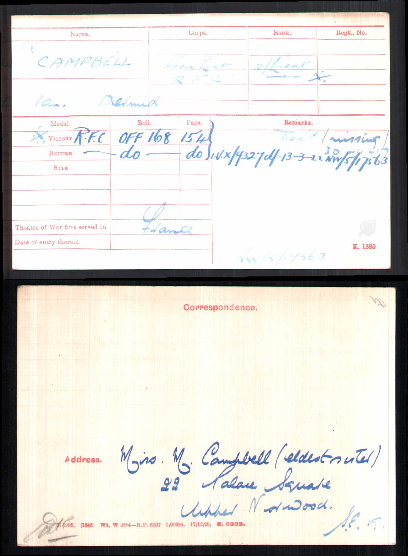 Son of John Stuart and Mary Anne Campbell. Son of the wealthy South African merchant John Stuart Campbell and lived at Inverdunning House, Dunning, Perthshire. He was a pupil at Murchison Castle when war was declared and enlisted from this school directly into the army where he was granted a commission in the RFC. After completing pilot training he was posted to 24 Sqn flying DH 5 scouts. In company with Capt Beanlank his flight commander he was jumped by four scouts of Jasta 11 and shot down by the Ace Leutnant Von Osten on the 30/11/17. ref. South African Roll of Honour 1914-1918 |