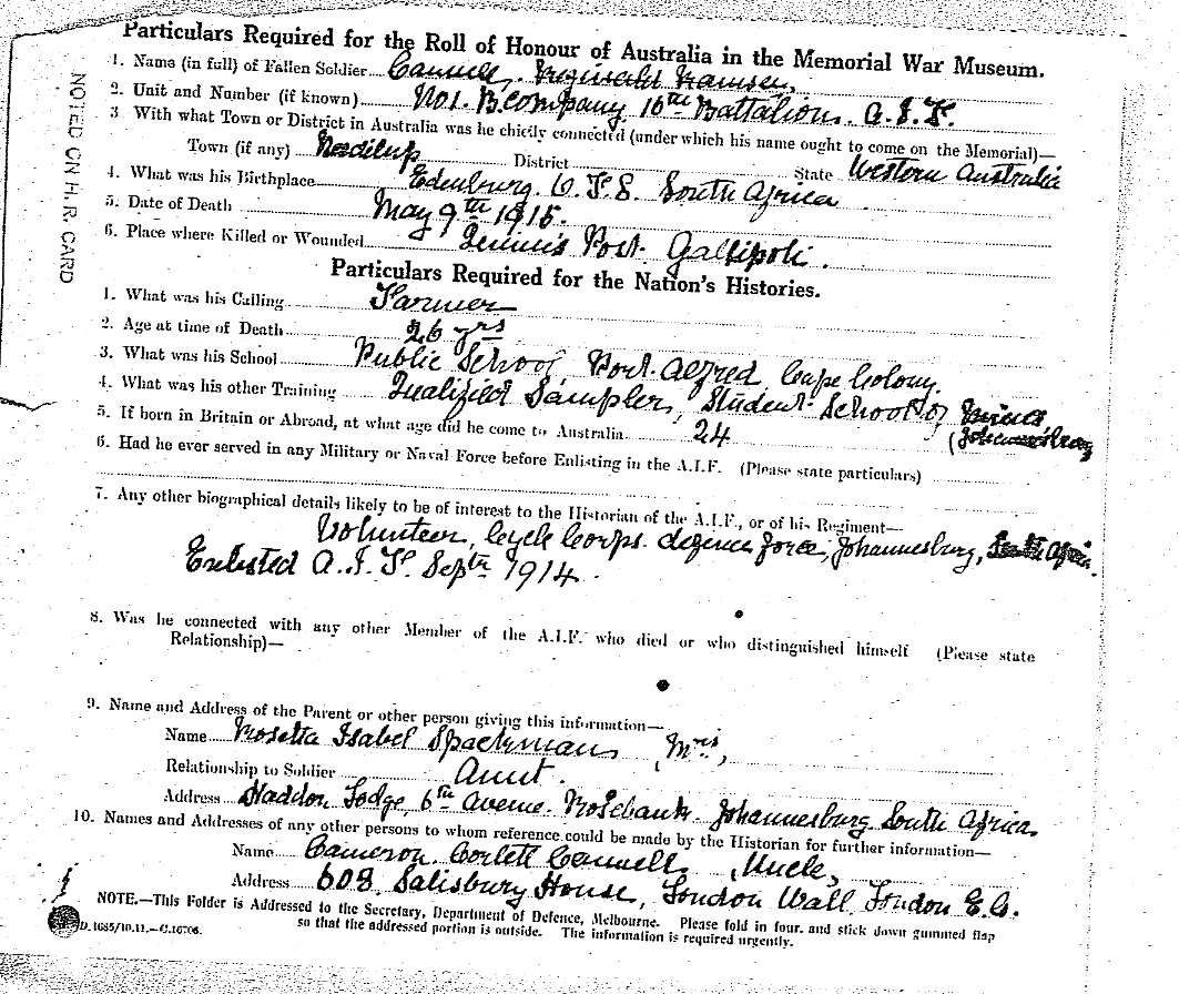 Son of Clifford Frank Ramsey Cannell and Molly Cannell. Born Edenburg, Orange Free State, South Africa. Educated Port Alfred Public School. A farmer. |