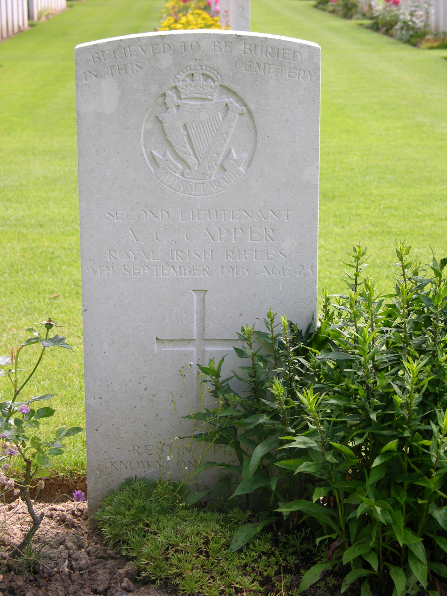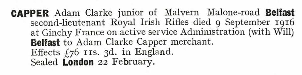 Son of Adam Clarke Capper and Rebecca Capper, of "Malvern," Malone Rd., Belfast. ref. South African Roll of Honour 1914-1918