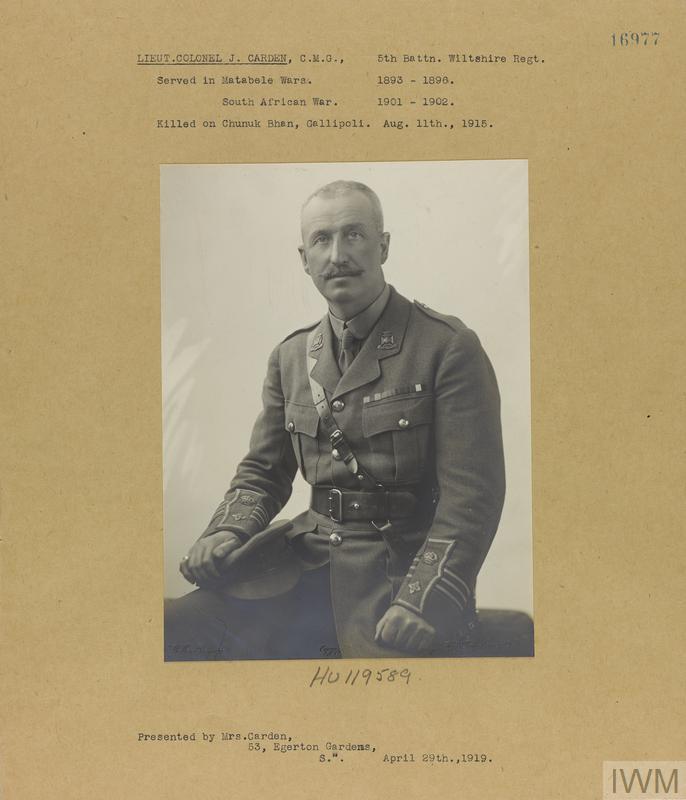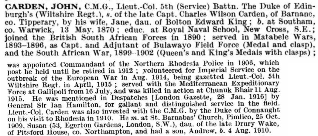 Son of Capt. Charles Wilson Carden (late 36th Regt.), and Mrs. Jane Bolton Carden, of Brixworth, Northampton; husband of Susan Carden. Was with the Pioneer Column for Mashonaland in 1890. Fought in the First Matabele War in 1893, as galloper and scout. Adjutant of the Bulawayo Field Force in Matabele Rebellion in 1896. Commandant of the Police depot at Salisbury, Rhodesia in 1898. Established Police post North of the Zambesi in 1899. Fought in the Boer War between 1901 and 1902. Commandant of the North Rhodesian Police in 1906. Administrator of Northern Rhodesia between 1907 and 1910. Invested as a Companion, Order of St. Michael and St. George (C.M.G.) in 1910. Commandant of Police Forces, North-East and North-West Rhodesia in 1911. Retired from the military in 1912, with the rank of Colonel, late of the British South Africa Police.  |