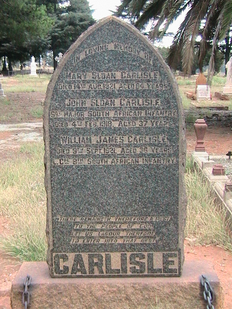 Son of Mary Sloan Carlisle. "News has been received by friends in this district of the death, in South Africa, of Sergeant Jack Carlisle, 3rd S.A.I., who died recently at the residence of his widowed mother, in Ninth Street, Boksburg North. The deceased gallant soldier, was a son of the late Mr. Robert Carlisle, formerly of Conlig, [Bangor, County Down, Northern Ireland] and emigrated about sixteen years ago to South Africa, where his mother joined him after his father's death. Deceased served through German West Africa, and on return at once volunteered for service overseas, where he saw service in Egypt and Gallipoli. In France later he was in many battles, including Delville Wood and Vimy Ridge, where he held up a party of 19 Germans for 19 hours. He was wounded at Verdun, and though given every help the exposure and wounds seemed to undermine his constitution, and from his return to South Africa in March, 1917, he had been almost continually ailing. Sergeant Carlisle also took part in the South African War. In civil life he was engaged in mining, and prior to enlisting was employed on the Glencairn Mine. Military honours were rendered at the funeral, deceased's mother, Mrs. Carlisle, being the chief mourner, and wearing her gallant son's many ribbons." Copied from The Newtownards Chronicle 1st March 1919 page 5. |