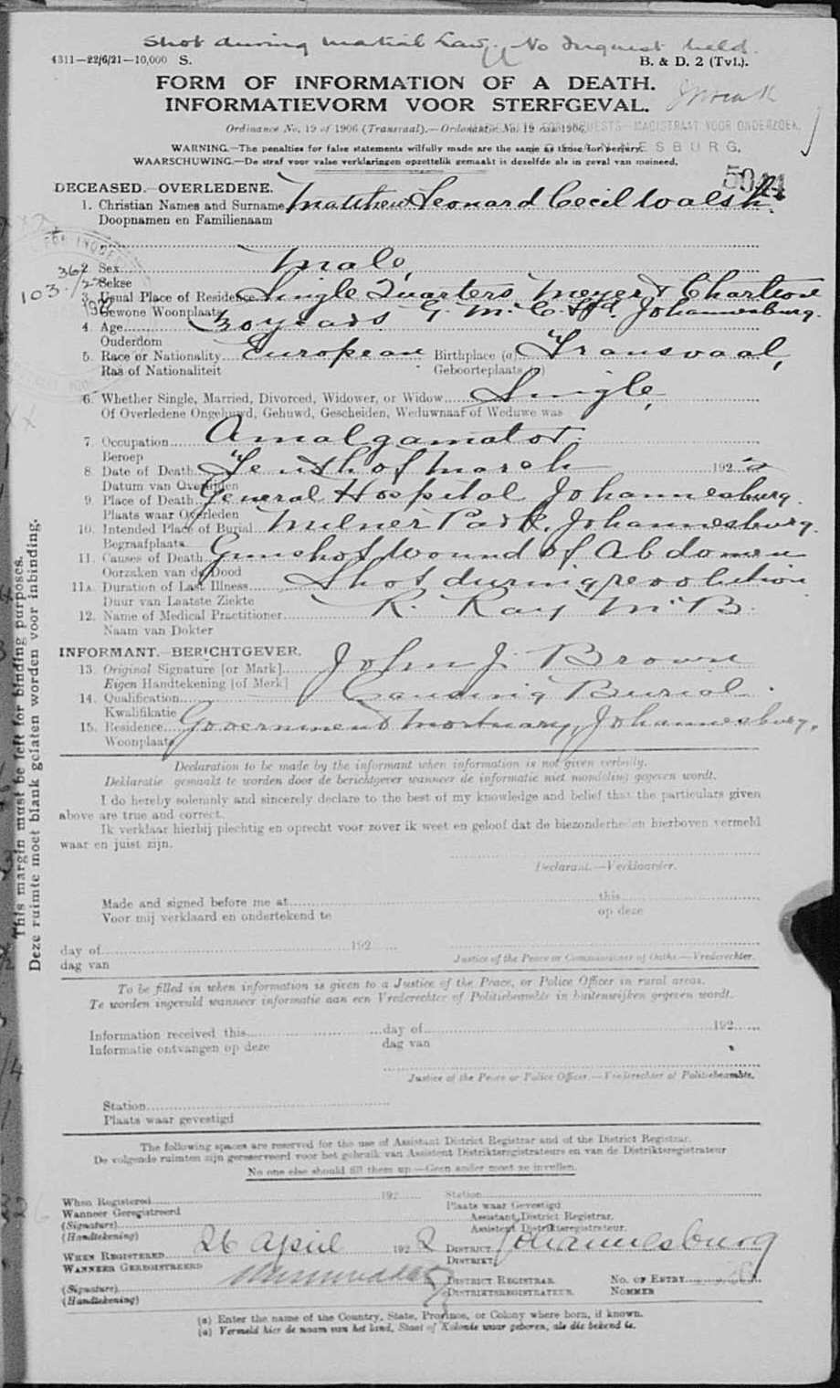 Died of wounds, received during an attack by rioters on the Police tent camp below the northern slope of Brixton Ridge, during Rand Revolt