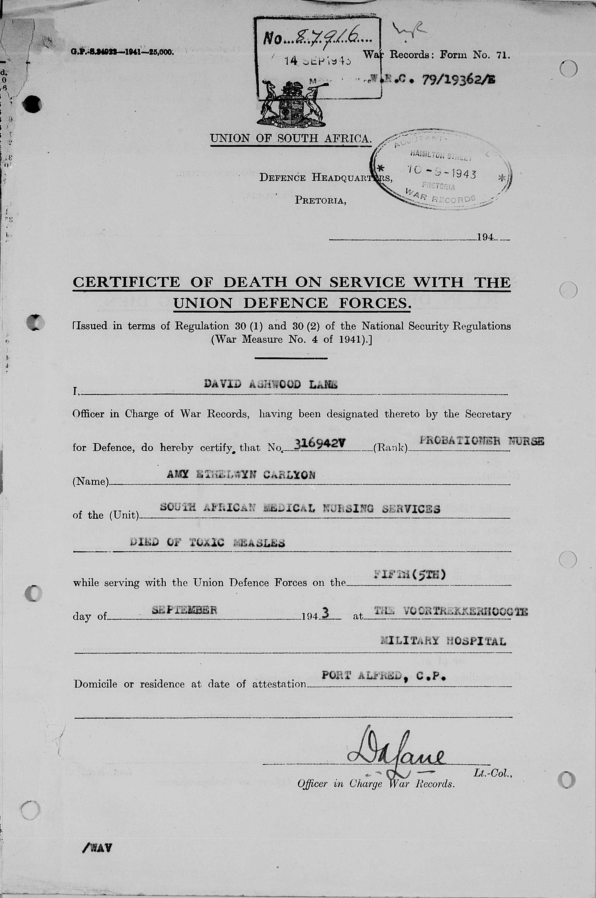 Other Casualties commemorated in South Africa