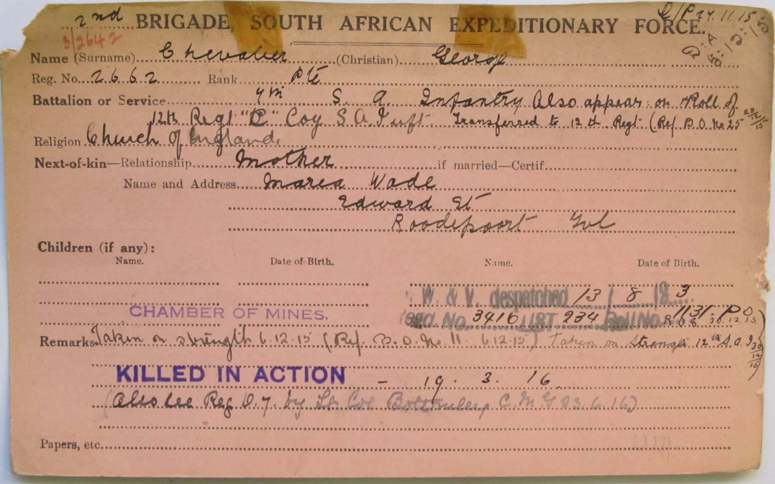Son of Maria Wade, of Roodepoort, Transvaal. Husband of Mary Chevalier, of Ivy Cottage, Thornton, Leicestershire, England. Born Queensland, Australia. A miner. Married just the month before his death on 7 February 1916