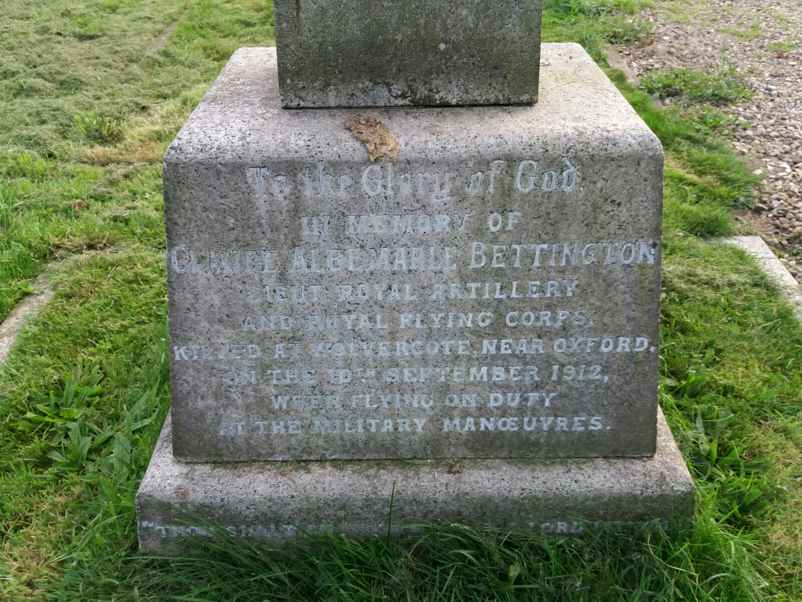 Died in Aircraft Accident. The autumn army manoeuvers of 1912 included the RFC for the first time. Bettington was paired with Edward Hochkiss, chief test pilot for the Bristol Aeroplane Company to fly a Bristol Coanda Monoplane 263. Taking-off from Larkhill at 07.00 on 10 September 1912 they flew directly to Port Meadow, Oxford which was the first stage. Arriving over Port Meadow at 2000 ft. On their approach for landing a quick-release catch holding a strap opened and the strap fractured a flying wire which whipped about, tearing a hole in the starboard wing. Fabric stripped off and control became impossible; the aircraft crashed into the ground at Lower Wolvercote, 120 yards (110 m) short of Port Meadow. Bettington was flung to his death from the aircraft and Hotchkiss perished in the ensuing impact |