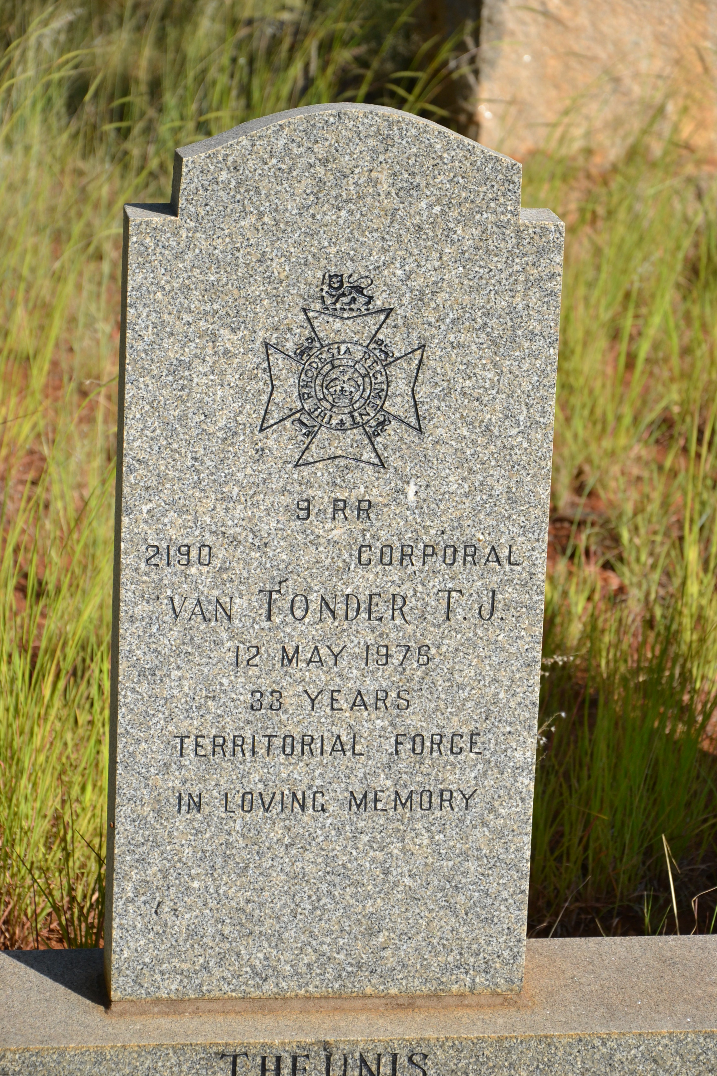 Husband of Beryl van Tonder and father of Maryna and Rene. ref. "Rhodesian Roll of Honour" by P. Geldenhuys (Roll compiled by Dr. J. R. T. Wood). Amendments from "Rhodesian Combined Forces Roll of Honour 1966-1981", by Adrian Haggett and Gerry van Tonder. |