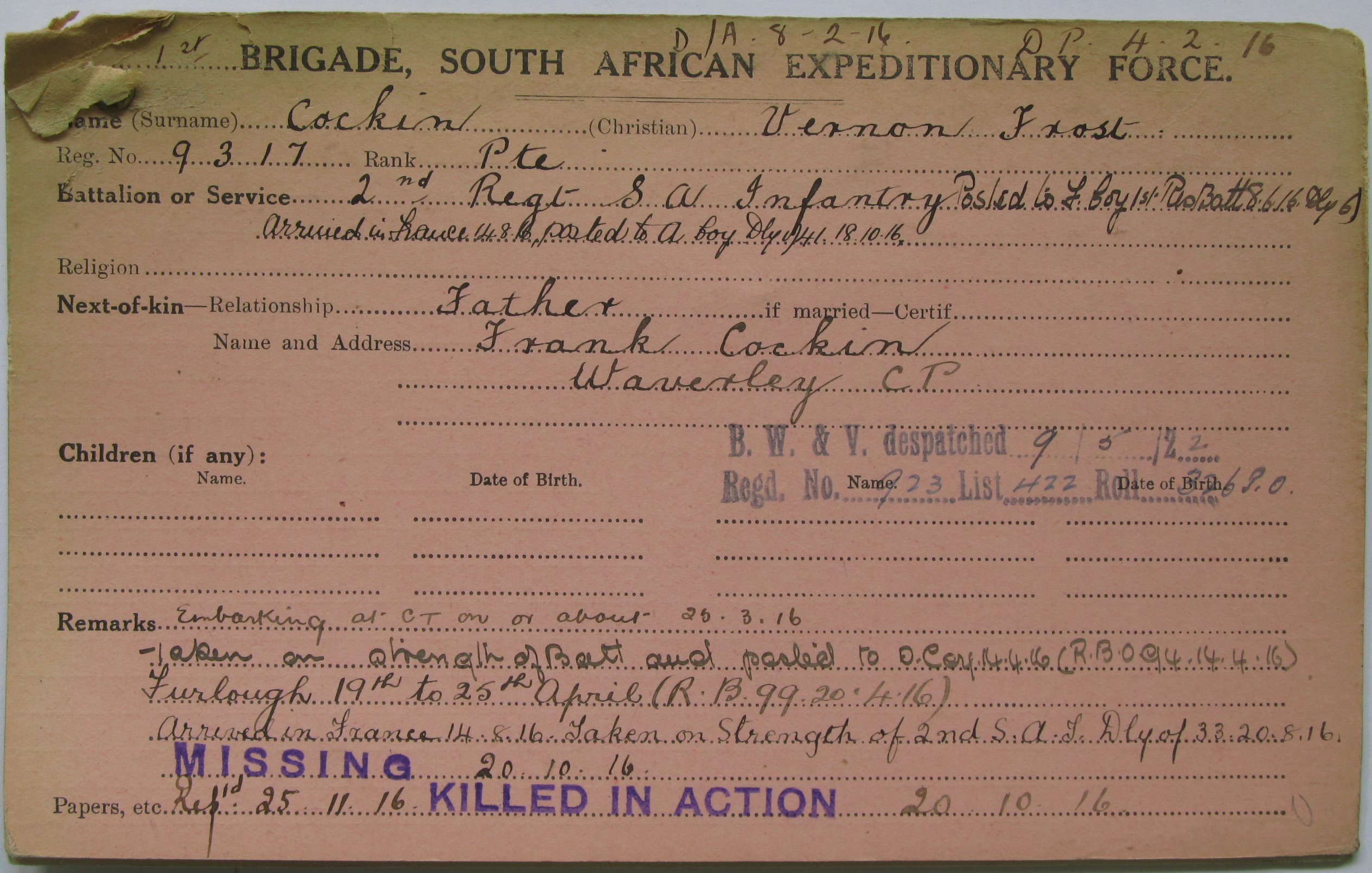 Son of Francis Hayward Cockin and Elizabeth Maria Cockin, of Waverley, Cape Province. |