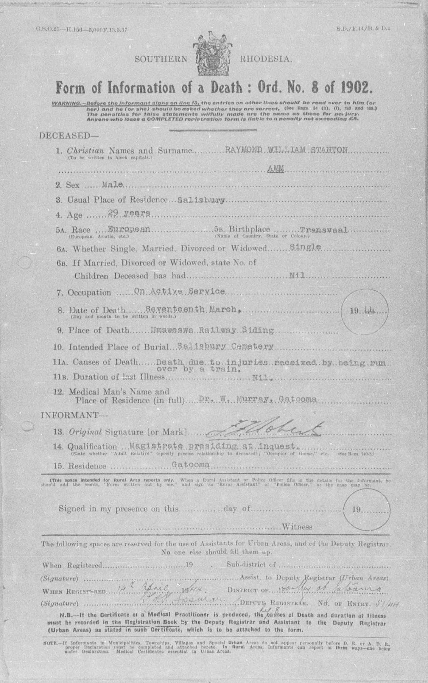Died of injuries, run over by a train