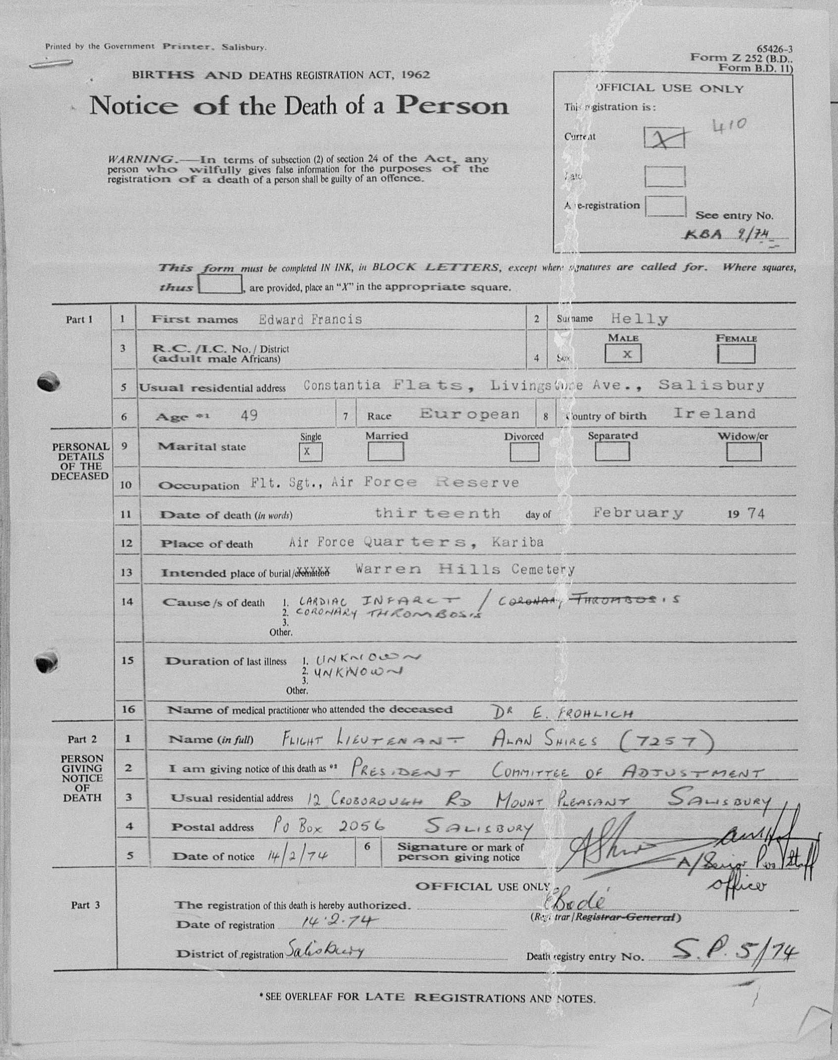 Died of heart attack, at the Forward Air Field, Kariba, on active service |