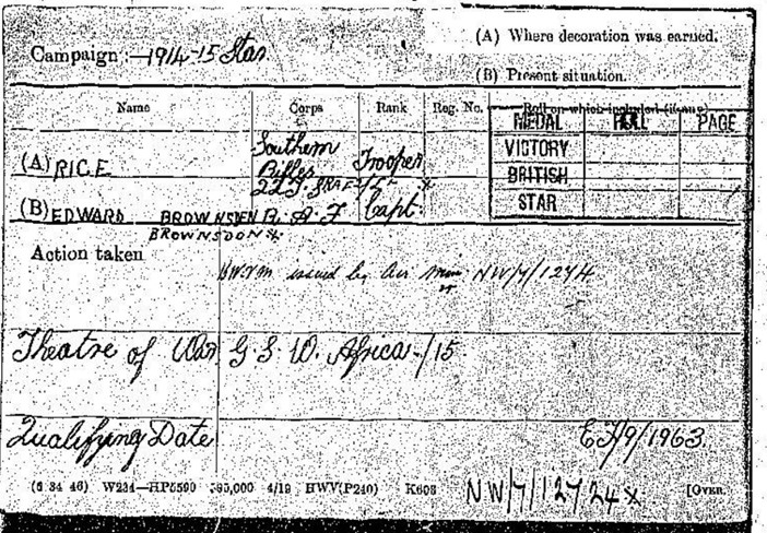 Son of Edward William and Mabel Eleanor Beatrice Rice. Born Claremont, Cape Town. A Trooper in the Southern Rifles, German South West Africa in 1915; Commissioned Second Lieutenant Royal Dublin Fusiliers 6 April 1916, joined Royal Flying Corps as Captain in 1917, remained in RAF as a career officer. Escaped from Singapore on the 16th February 1942 but was captured by the Japanese. Shipped from Palembang to Singapore on 18 July 1942. Then, in August he was shipped with the captured generals and other senior officers to Formosa on the hellship England Maru which arrived at Takao on 29 August. He was sent to the senior officers' camp of Karenko and held there until June 1943. Karenko Camp was closed and the POWs were transferred to Shirakawa Camp in southwestern Formosa |