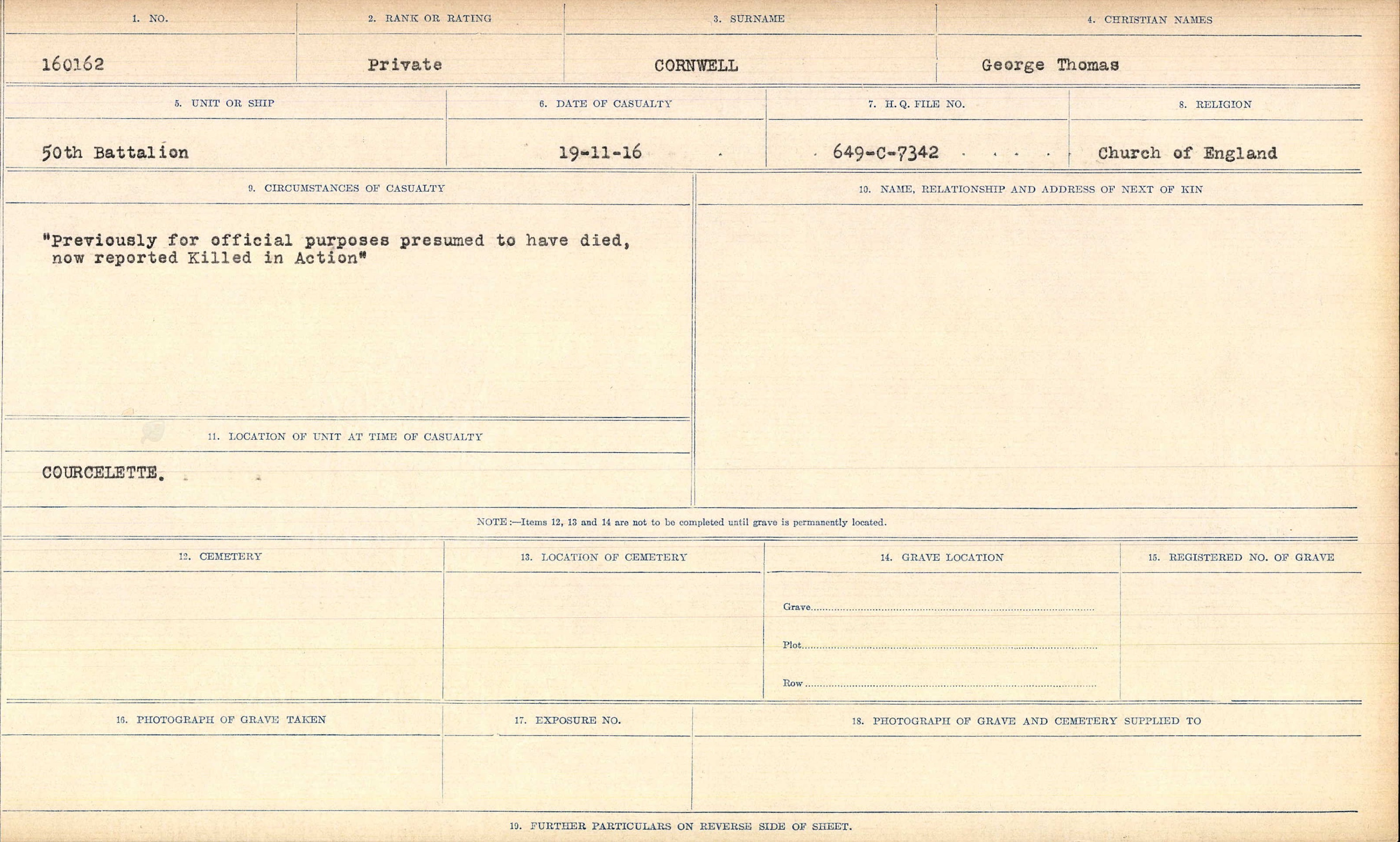 Husband of Peggy Cornwell, Calgary, Alberta, Canada. Born Black Rock, Dublin, Ireland. Previous service with Cape Town Western Mounted Rifles. ref. South African Roll of Honour 1914-1918