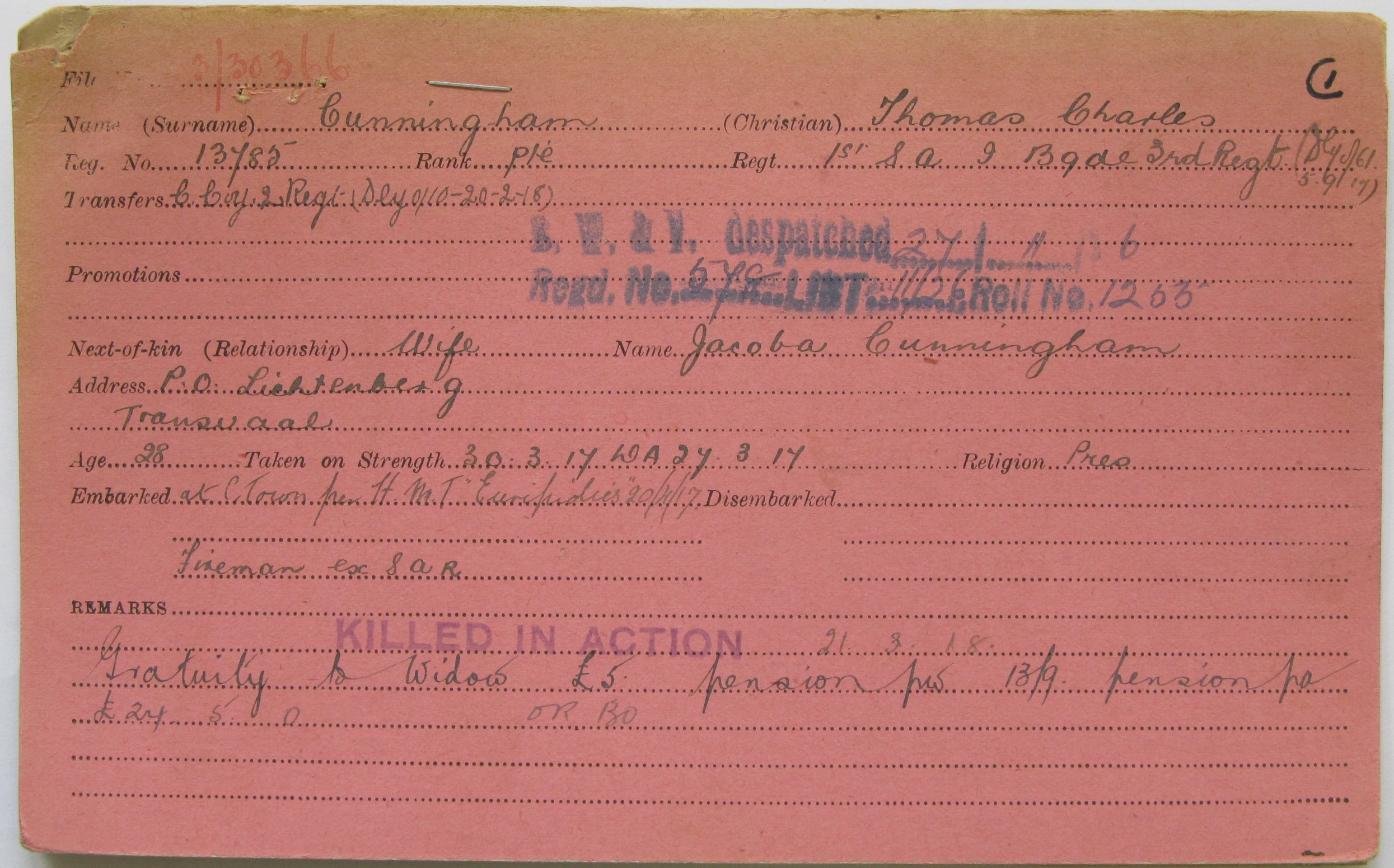 Son of John and Johanna Cunningham, of 119, Francis St, Bellevue, Johannesburg. Husband of the late Sara Cunningham, of Carl St., Jeppes, Transvaal. Born Kimberley. A fireman with South African Railways