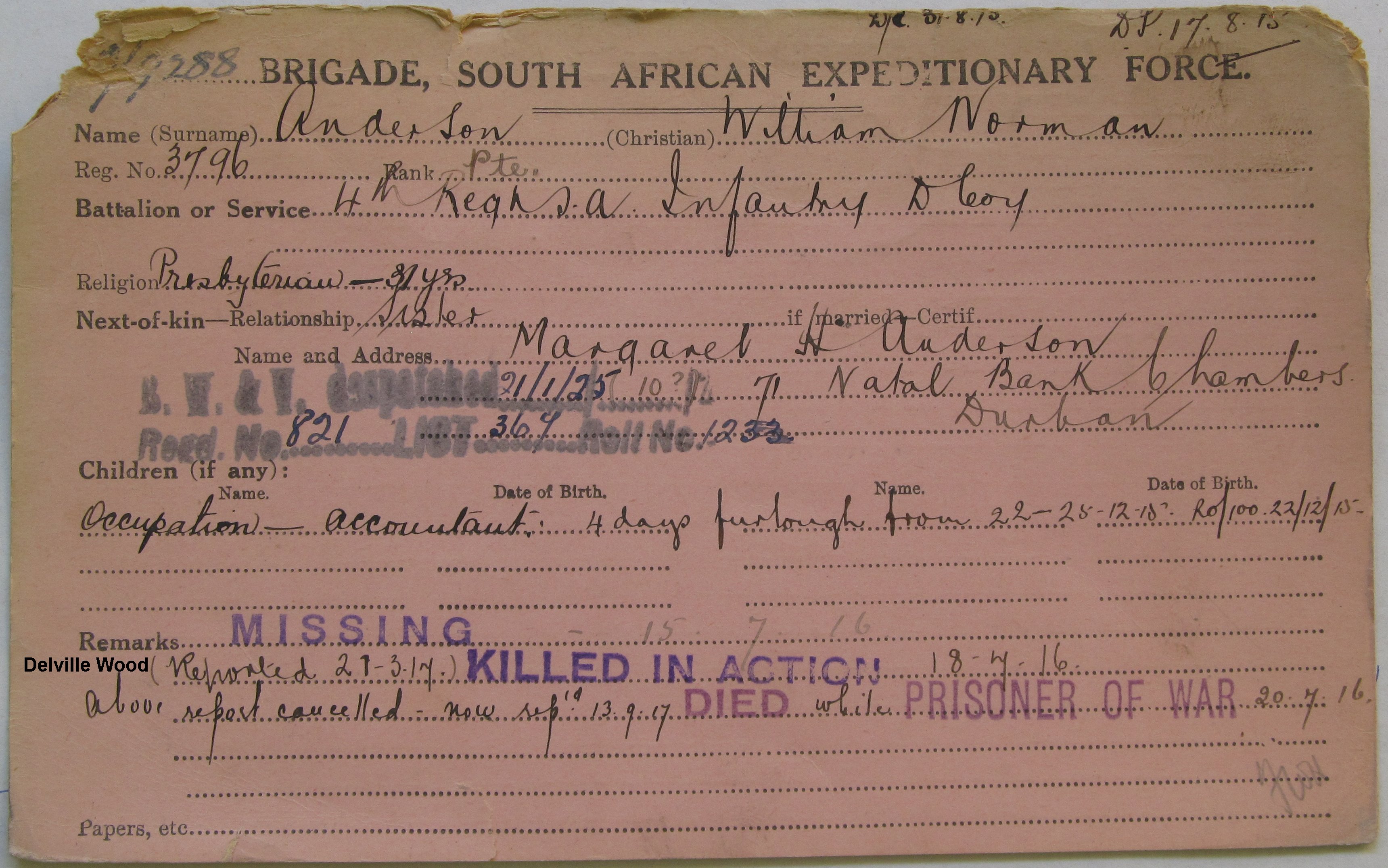 Died of wounds, received at Delville Wood, whilst a POW |