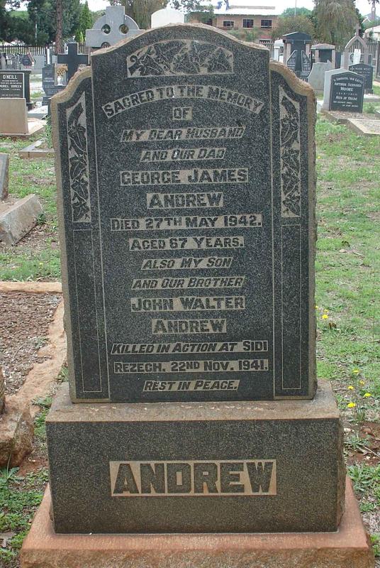 Son of George James and Ivy A. Andrew, of Brakpan, Transvaal, South Africa. Commemoration stone in Brakpan Cemetery