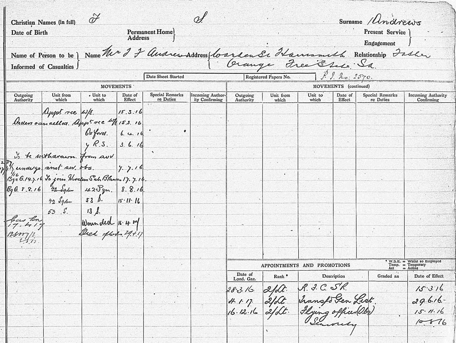 Died of wounds, received 16th April at the Battle of Arras, whilst flying. Shot down on 16 April whilst artillery spotting over the German lines, Lieutenant Alphonso Pascoe and his observer Frederick Seymour Andrews became the German flying ace Baron von Richtofen's 45th "kill". According to Richtofen, the British BE2e was flying at an altitude of 800 metres when he approached unseen from behind and made his attack. Pascoe momentarily lost control of the plane, managed to steady it and then lost control again. The plane plummeted the last 100 metres to the ground. Both Pascoe and Andrews were badly wounded, Pascoe survived, Andrews died of his wounds thirteen days later. |