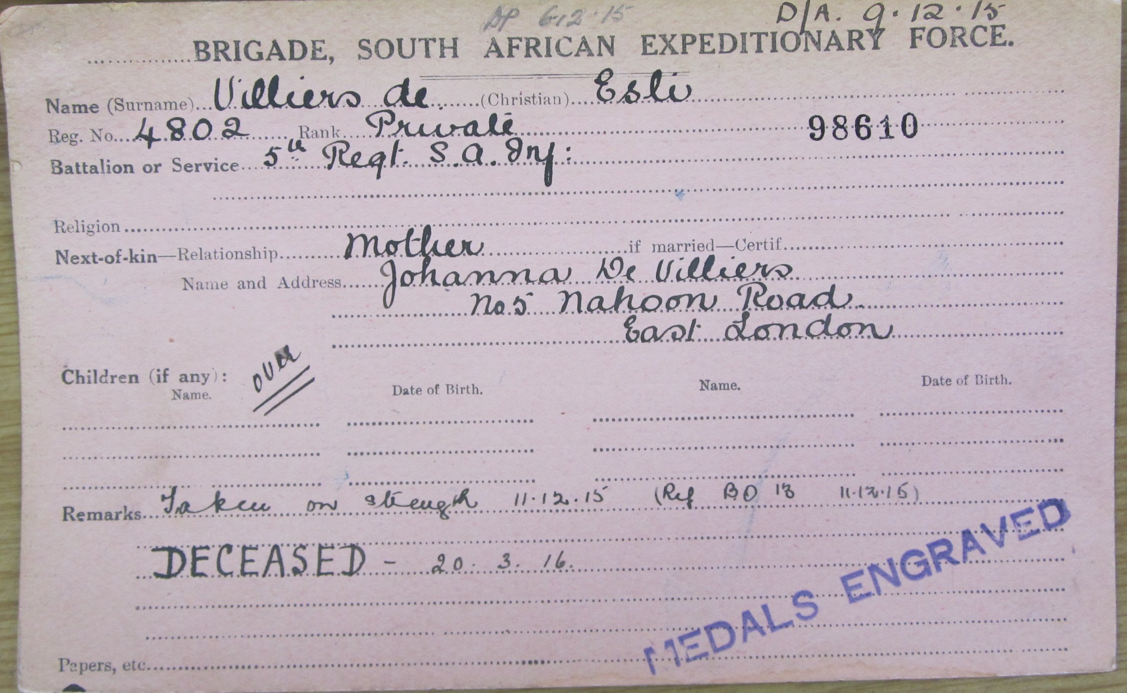 Son of Pieter Daniel Wilhelmus de Villiers and Johanna Christina (nee Vogel) de Villiers, of Southernwood, East London, Cape Province.
