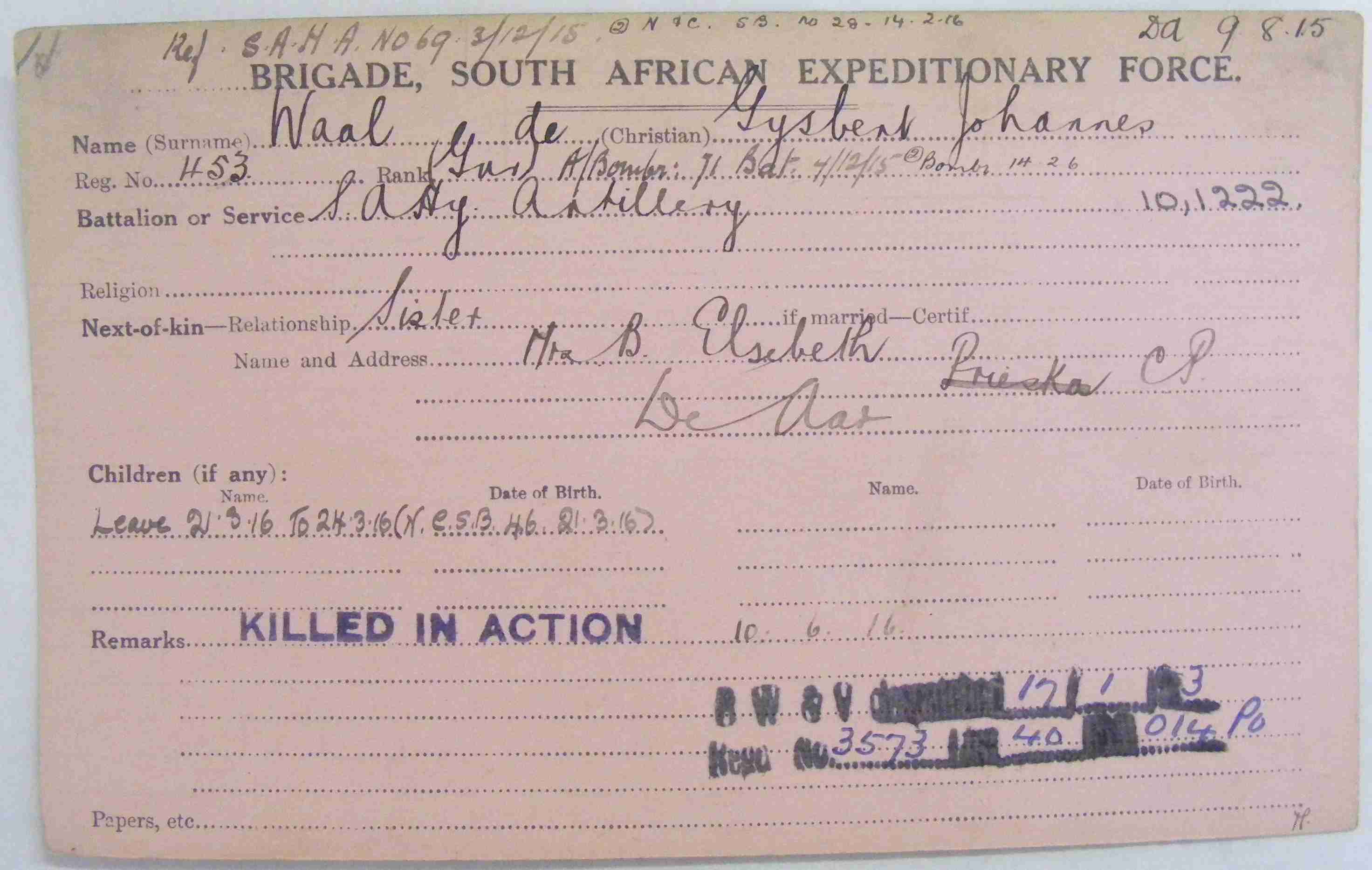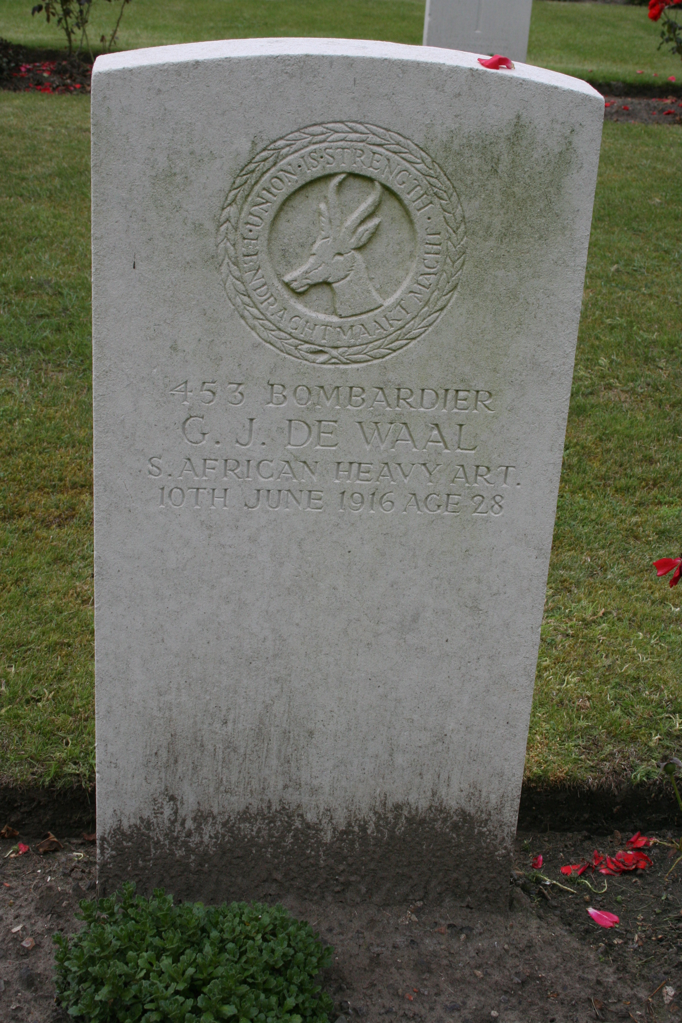 Son of Jan Johannes and Anna Elizabeth de Waal. Born Prieska, Cape Province. Former South African Policeman. On Cape Town "Company Gardens" Artillery Memorial