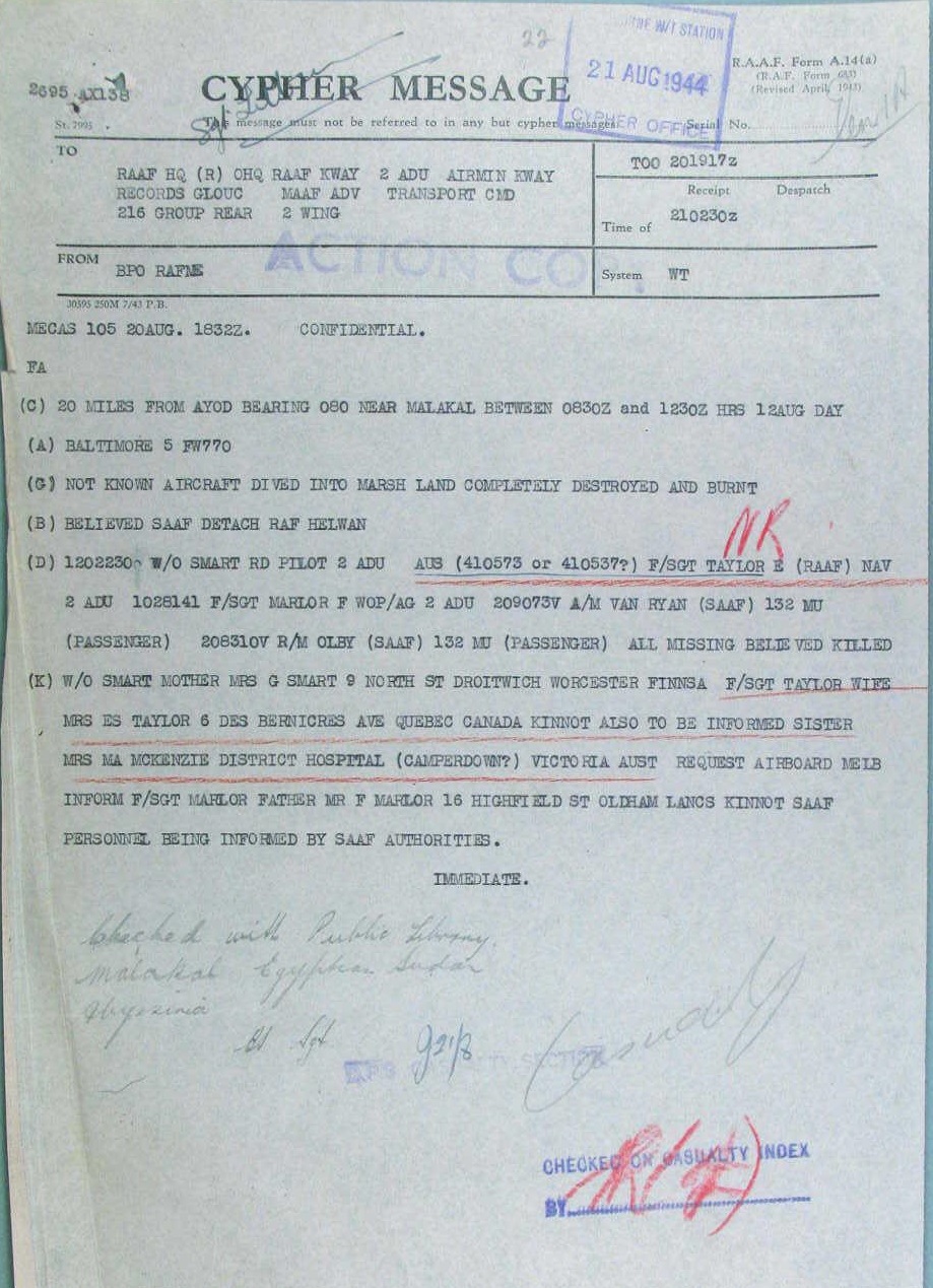 Died in Aircraft Accident, Baltimore FW 770, flew bad weather when leading 6 Hurricanes on a ferry flight aircraft crashed into marsh near Malakal 95 Miles North of Wau, Sudan |