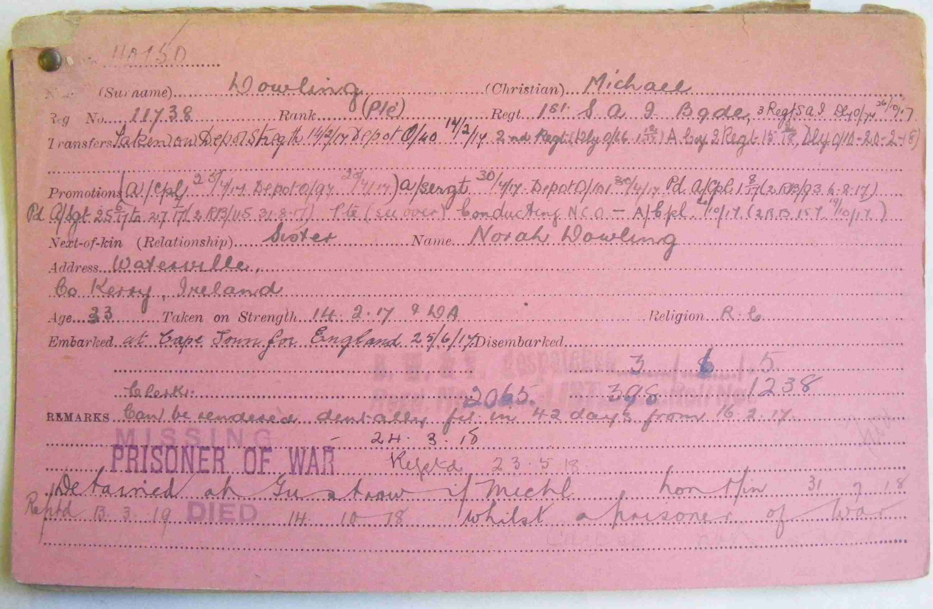 Son of Thomas and Mary Dowling, of 2, Lower Yellow Rd., Waterford, Co. Kerry. Born at Dromkare, Waterville.