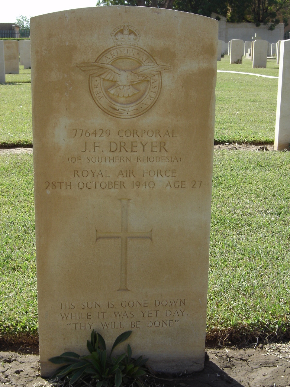 Son of Johan Frederick and Petronella Johanna Dreyer (nee du Toit); husband of Elizabeth Magrietha Dreyer (nee Hoffman), of Salisbury, Southern Rhodesia. On war memorial in Marandellas, Rhodesia. Now known as Marondera, Zimbabwe.