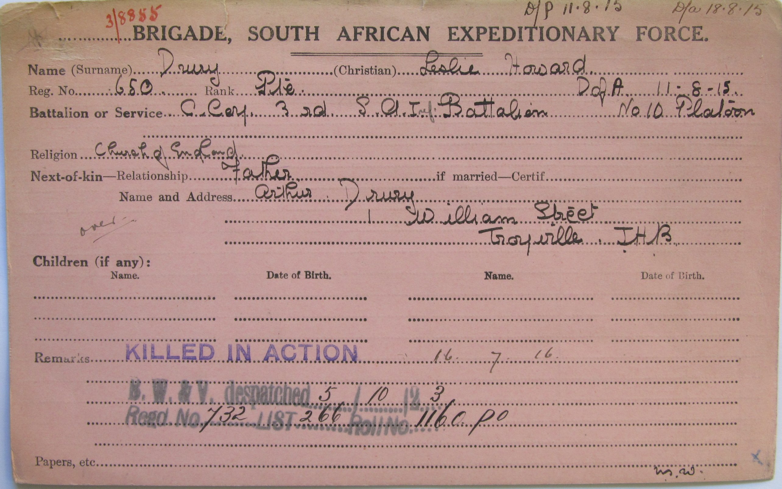 Son of Arthur and Harriet Emiline Drury, of 16, Alice Rd., Kensington, Johannesburg, South Africa. On Bezuidenhout Valley War Memorial