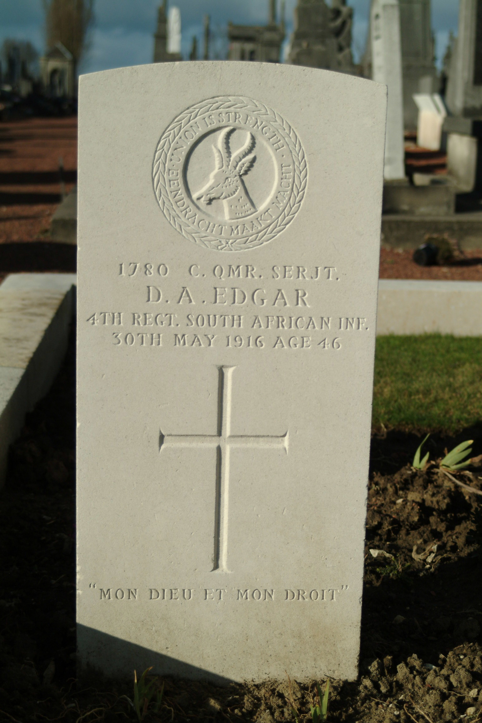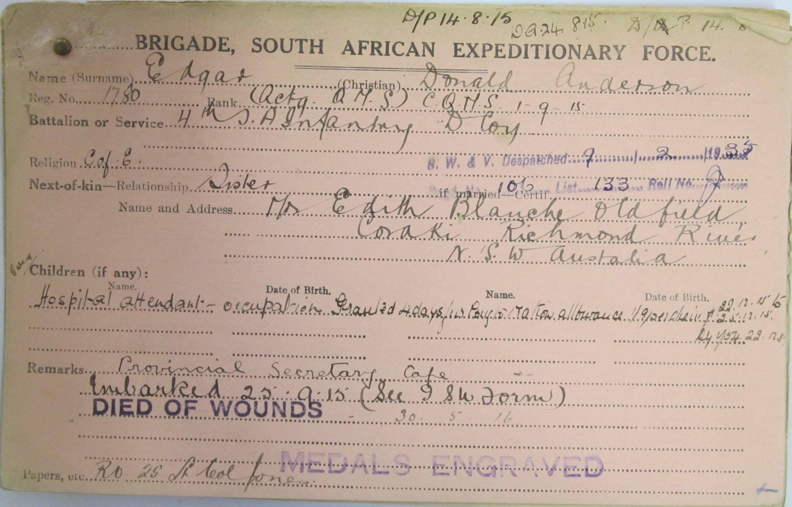 Son of the late Lt. Col. Donald Ramsey and Ellen Martha Edgar, of Bradford, England. Husband of Kate Edgar. Born Shelf near Halifax, Yorkshire, England. A hospital attendant. Also served in German West Africa.