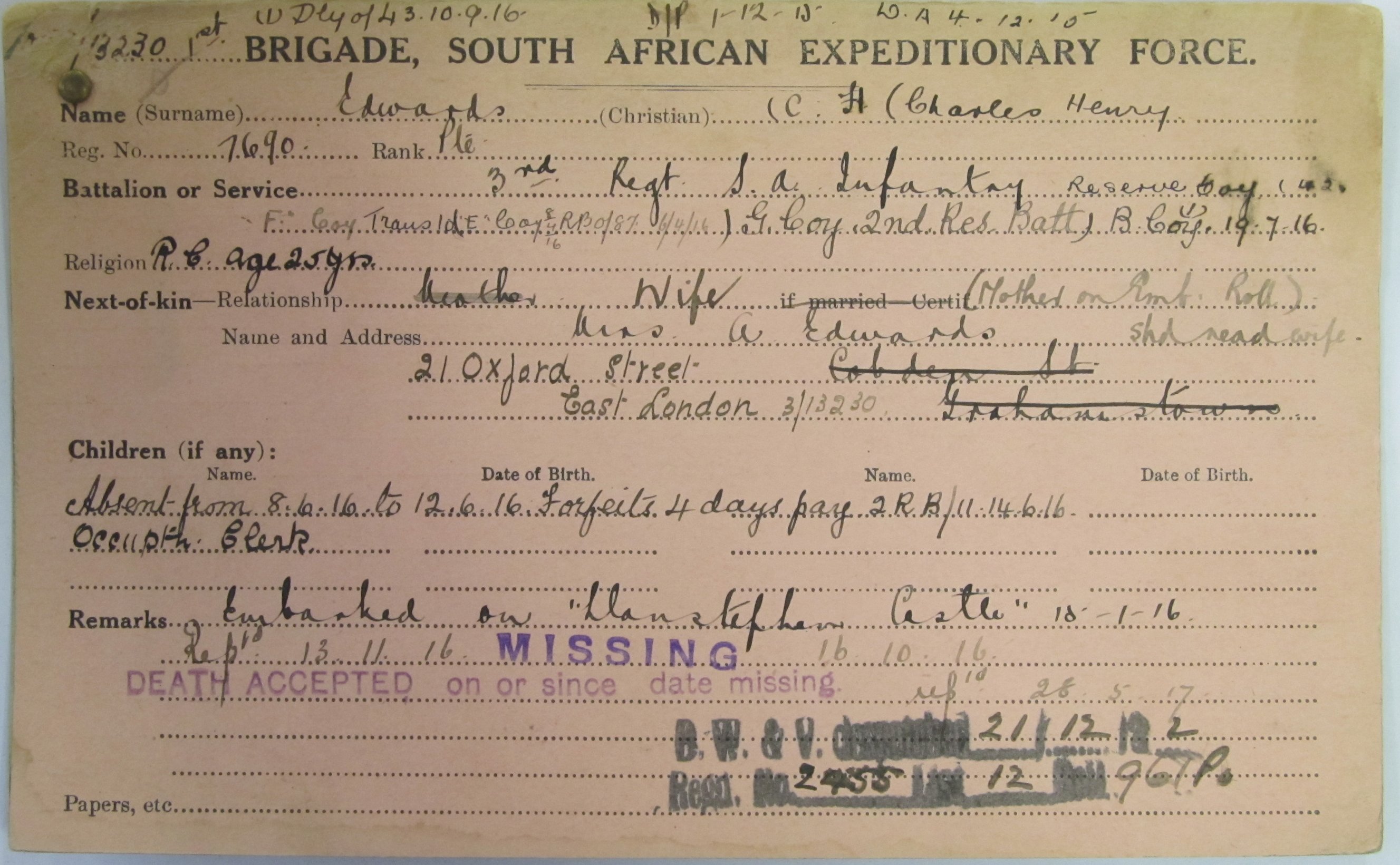 Son of Charles Edwards, of Graham's Town, Cape Province; husband of Alice Lucy Nicholas (formerly Edwards), of 53, St. Paul's Rd., East London, Cape Province. Declared missing in action, his body was found after the war.