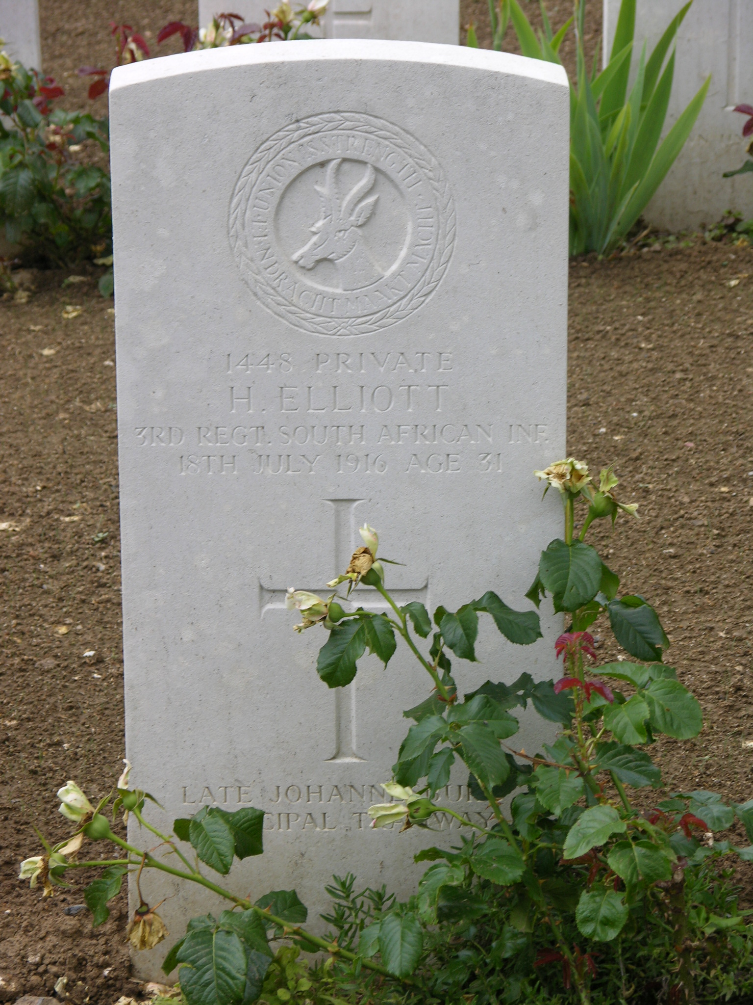 Son of Charles Elliott, of Cape Colony; husband of Helen Harper (formerly Elliott), of 11, Highgate St., Jeppe, Johannesburg.