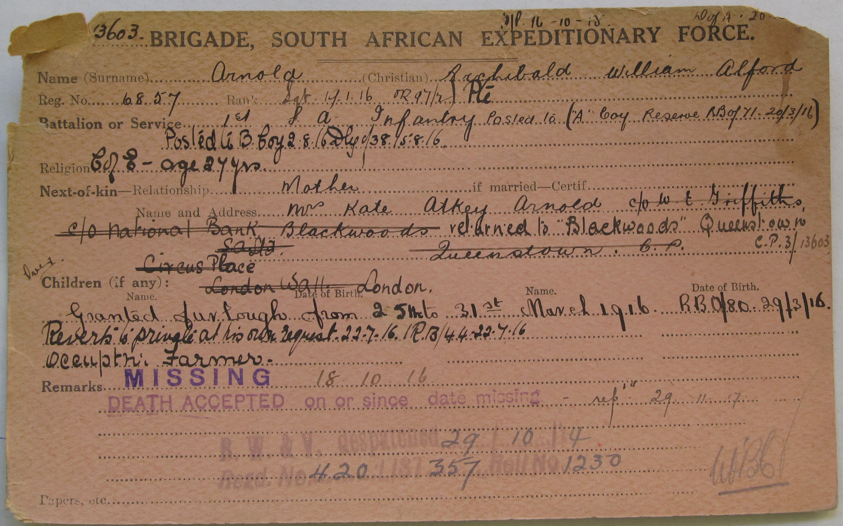 Son of William Isaac and Kate Atkey Arnold, of 6, Shepstone St., Queenstown, Cape Province. Commemoration stone in Queenstown Cemetery. On ROH plaque in Christ Church in Mayfair |