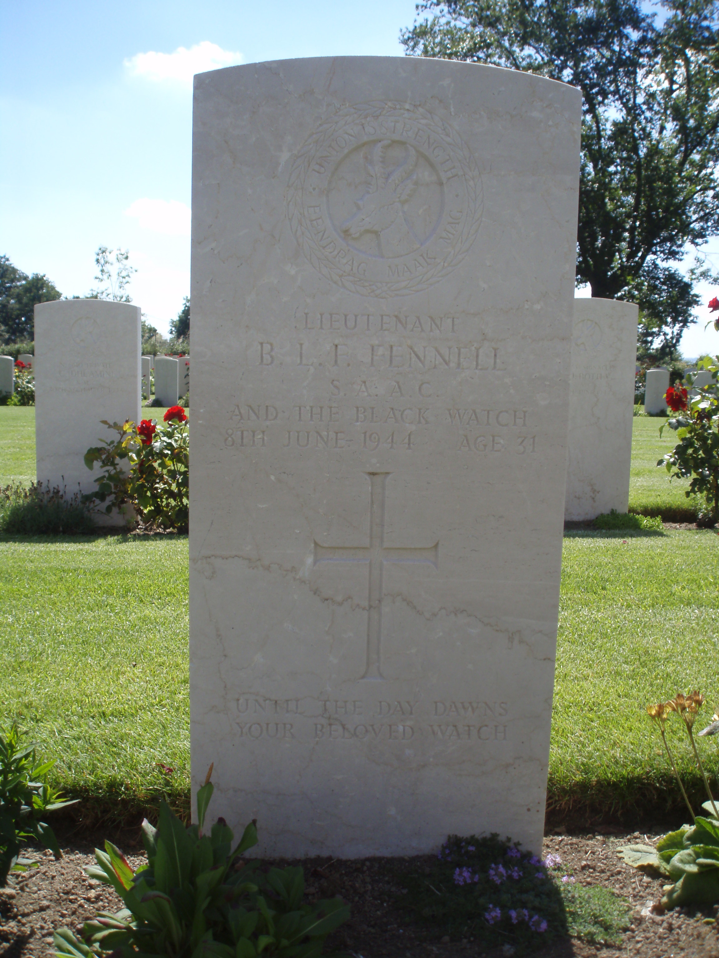 Killed in action, in Italy. An extract from the 6th Bn, Black Watch War diary for the 9th June 1944 reads "Before leaving June 8th there are a number of incidents worth recording. The first concerns "B" Coy's advance when they were moving through a cornfield. Suddenly two Germans rose and put their hands up. Our men who had started firing were told to stop by their officer (Lt Fennell), when suddenly Boche M.G. opened up from several directions killing Lt Fennell and one or two other men. Whether the surrendering of the Boche was part of a trap cannot be definitely said but the possibilities are there." |