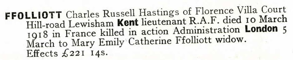 Son of Charles Nicholas and Ethel Treliving Ffolliott. Husband of Mrs. Mary Emily Catherine Ffolliott. In February 1918 he had flown as Observer in the DH4 piloted by Canadian ace Alfred Clayburn Atkey when he shot down two of the thirty eight enemy aircraft credited to him. On Lewisham, St Saviour Catholic Church WW1 War Memorial. ref. South African Roll of Honour 1914-1918 |