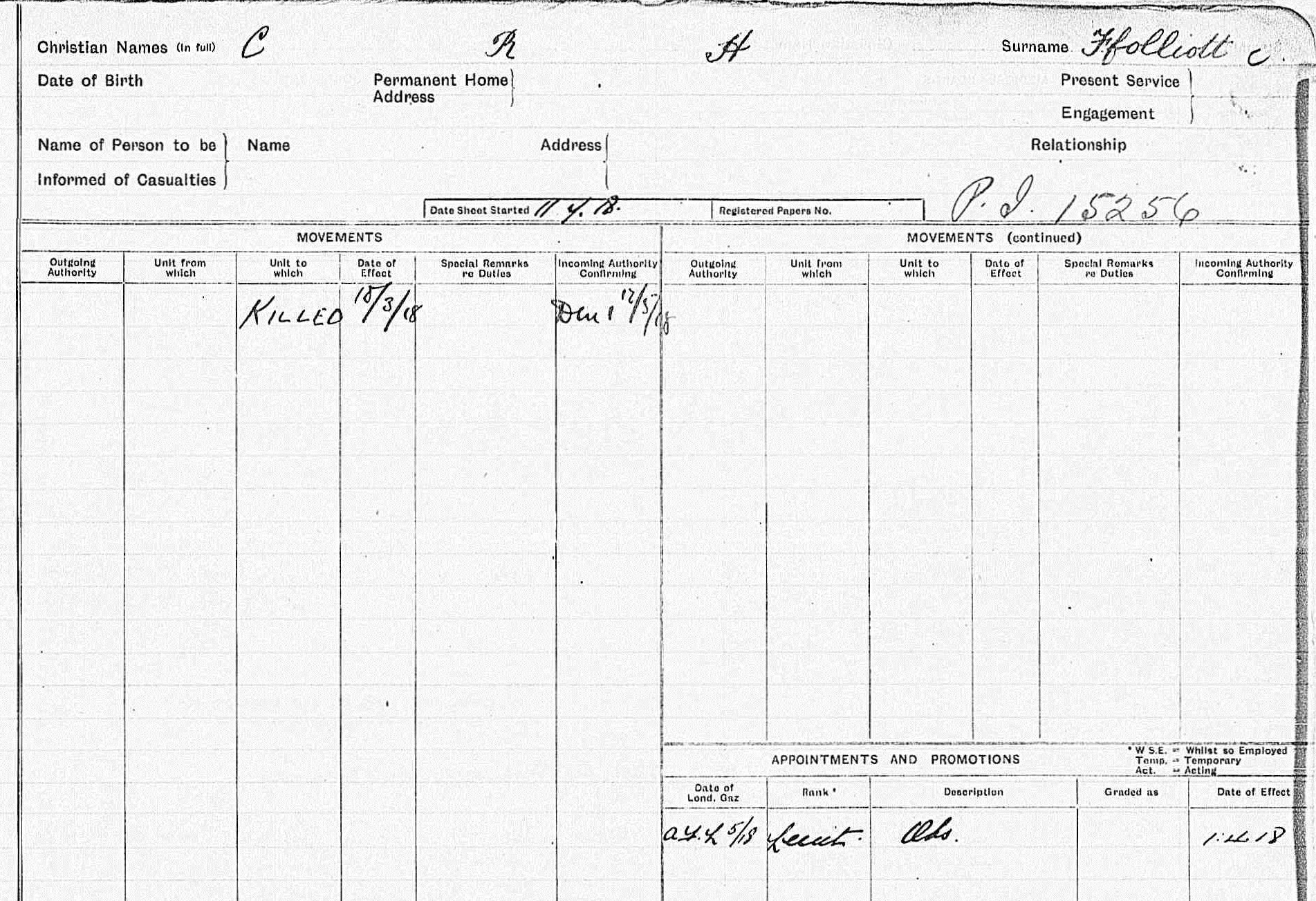 Killed in action, took off on a bombing raid at 10.55 in DH4 A7719 of 18 Squadron, flying as observer with pilot 2nd Lt J N B McKim. The combat report stated that they were "last seen going down under control near Oignies at 12.00 during combat with enemy aircraft during bombing". Oignies is east of Lens. |
