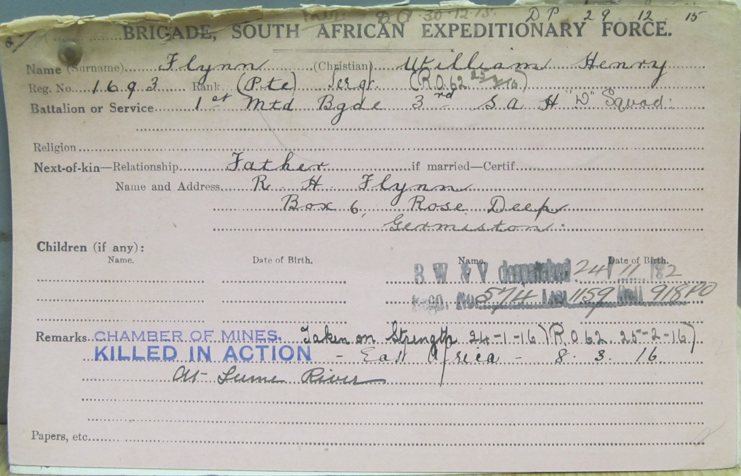 Son of Richard Henry Flynn and Jane Mariah Flynn, of Germiston, Transvaal. Born Queenstown. A cyanider, simmer and jack. His brother also died in service |