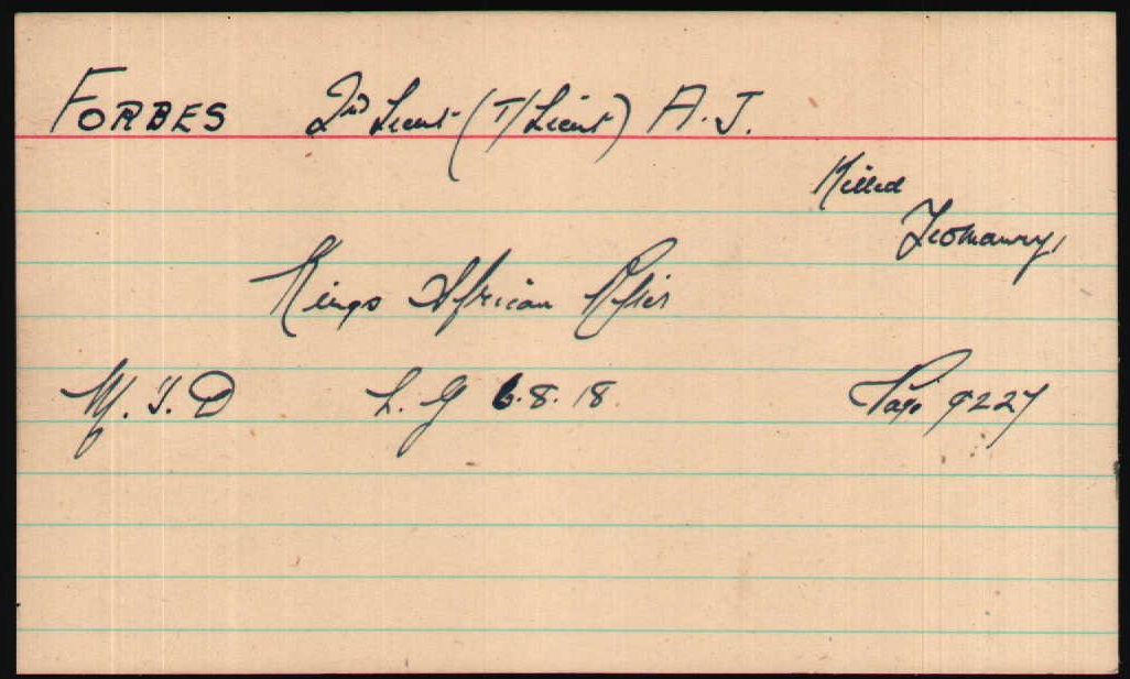 Son of Mr. H. Forbes, Deputy Mayor, of Port Elizabeth. Educated at St. Andrew's College, Grahamstown. On Nigel Town Monument. ref. South African Roll of Honour 1914-1918. |