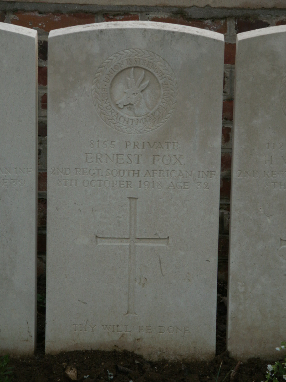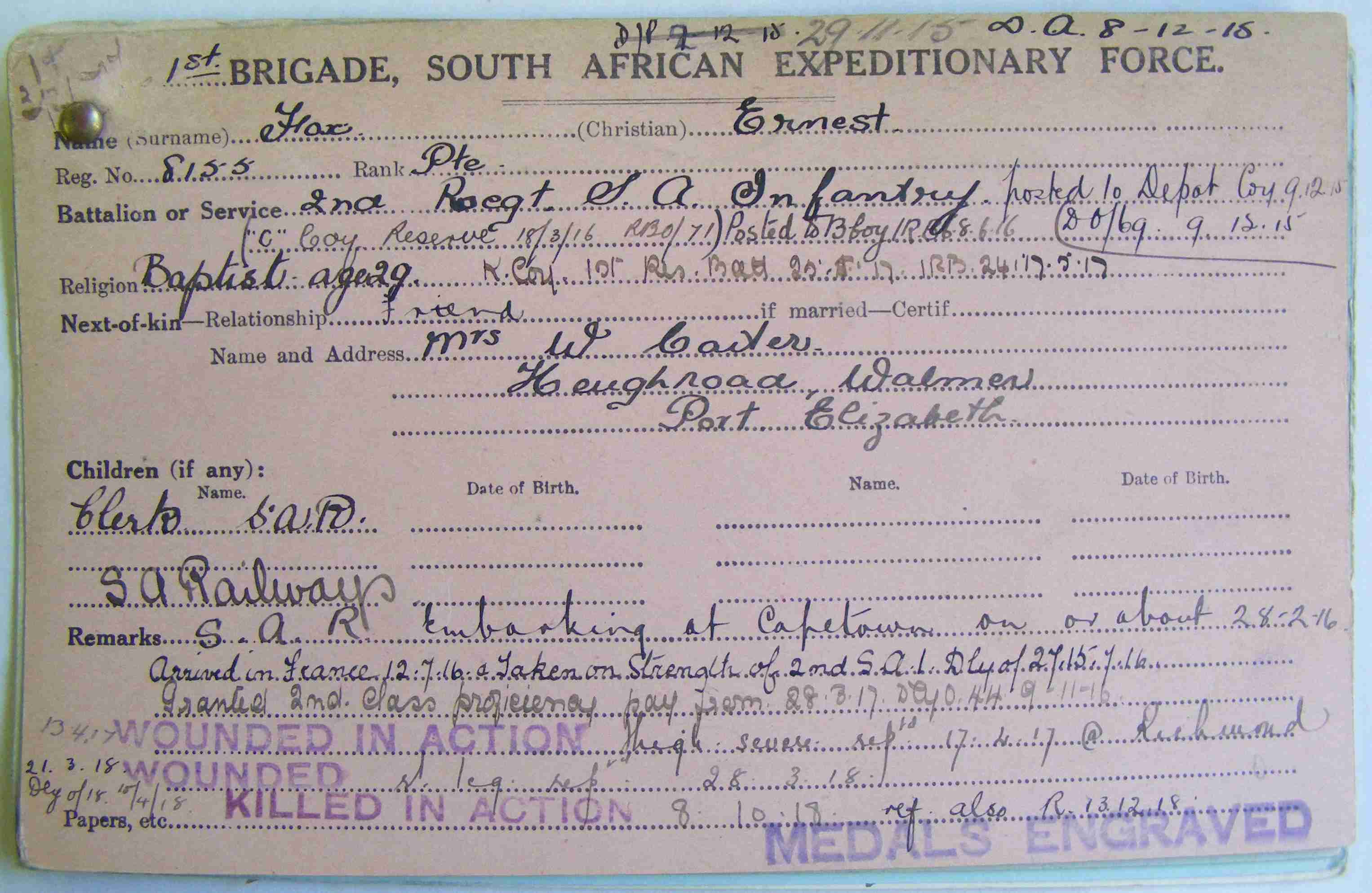 Son of Thomas and Mary Hannah Fox, of 54 York Buildings, Rissek St., Johannesburg. Native of Birkenhead, England.