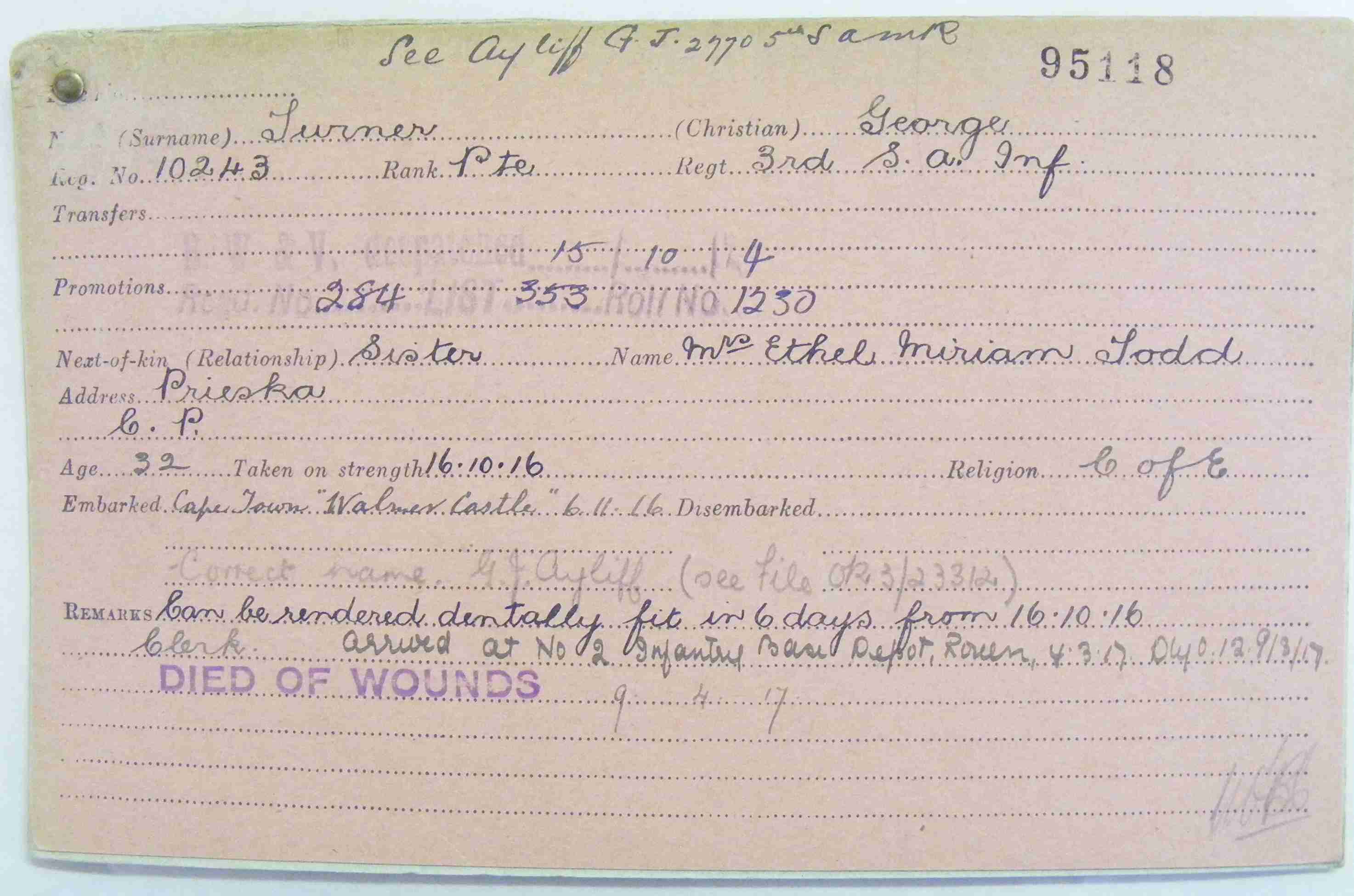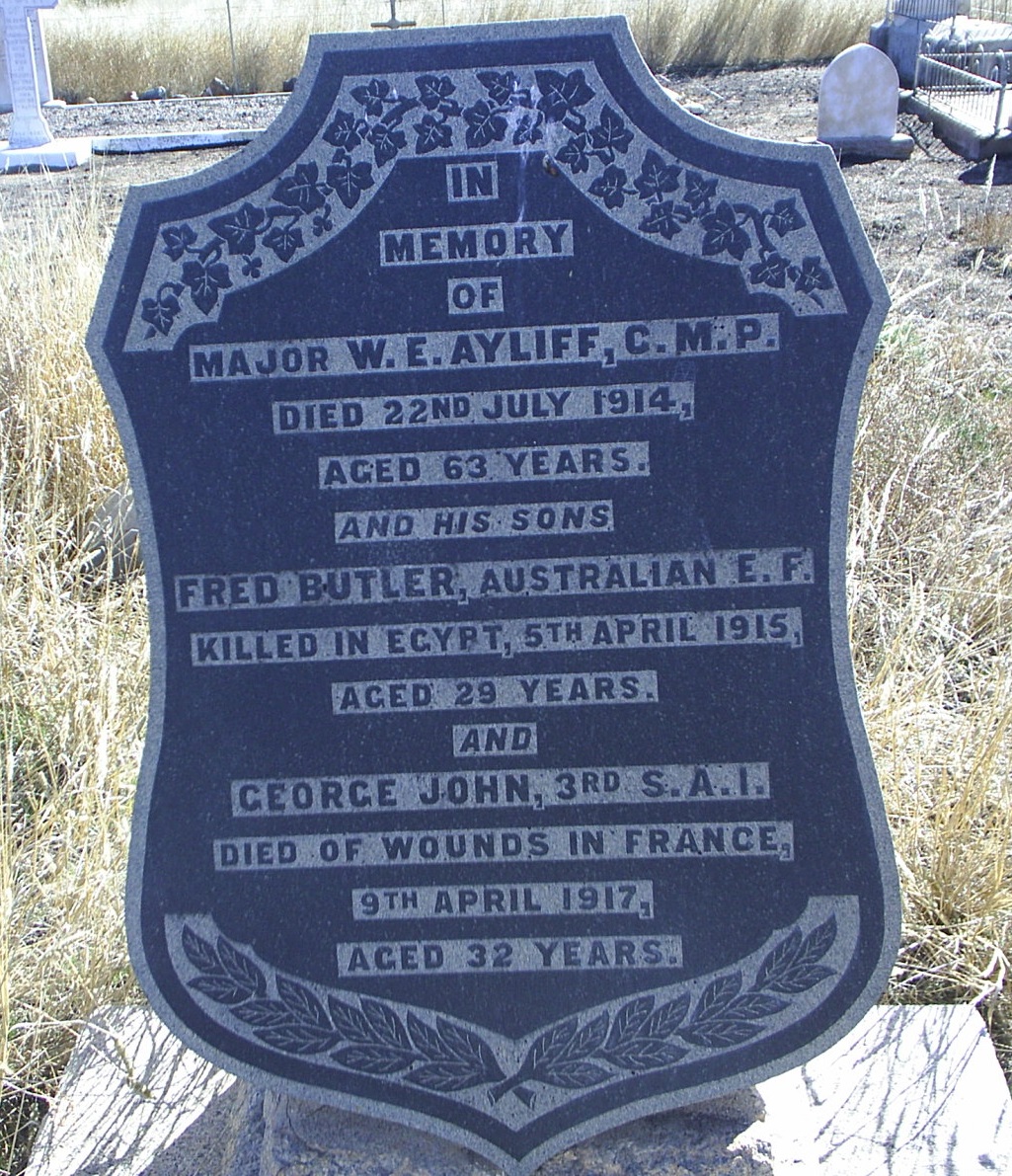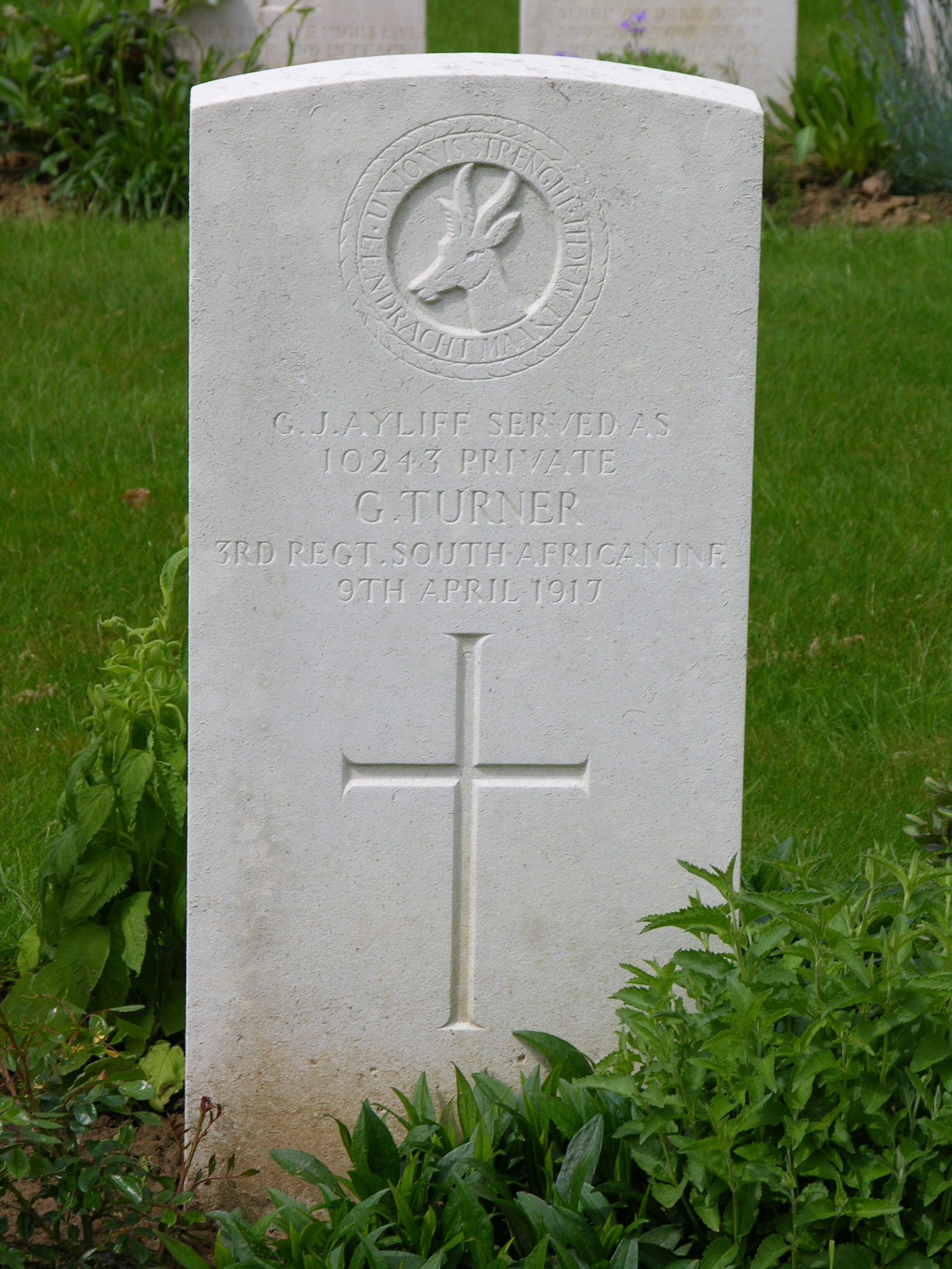 Son of Major W. E. Ayliff, late of the Cape Mounted Police. Brother of Ethel Todd, of Prieska, South Africa. (Served as George TURNER). Commemoration stone in Northern Cape, PRIESKA, Old cemetery. His brother also died on service