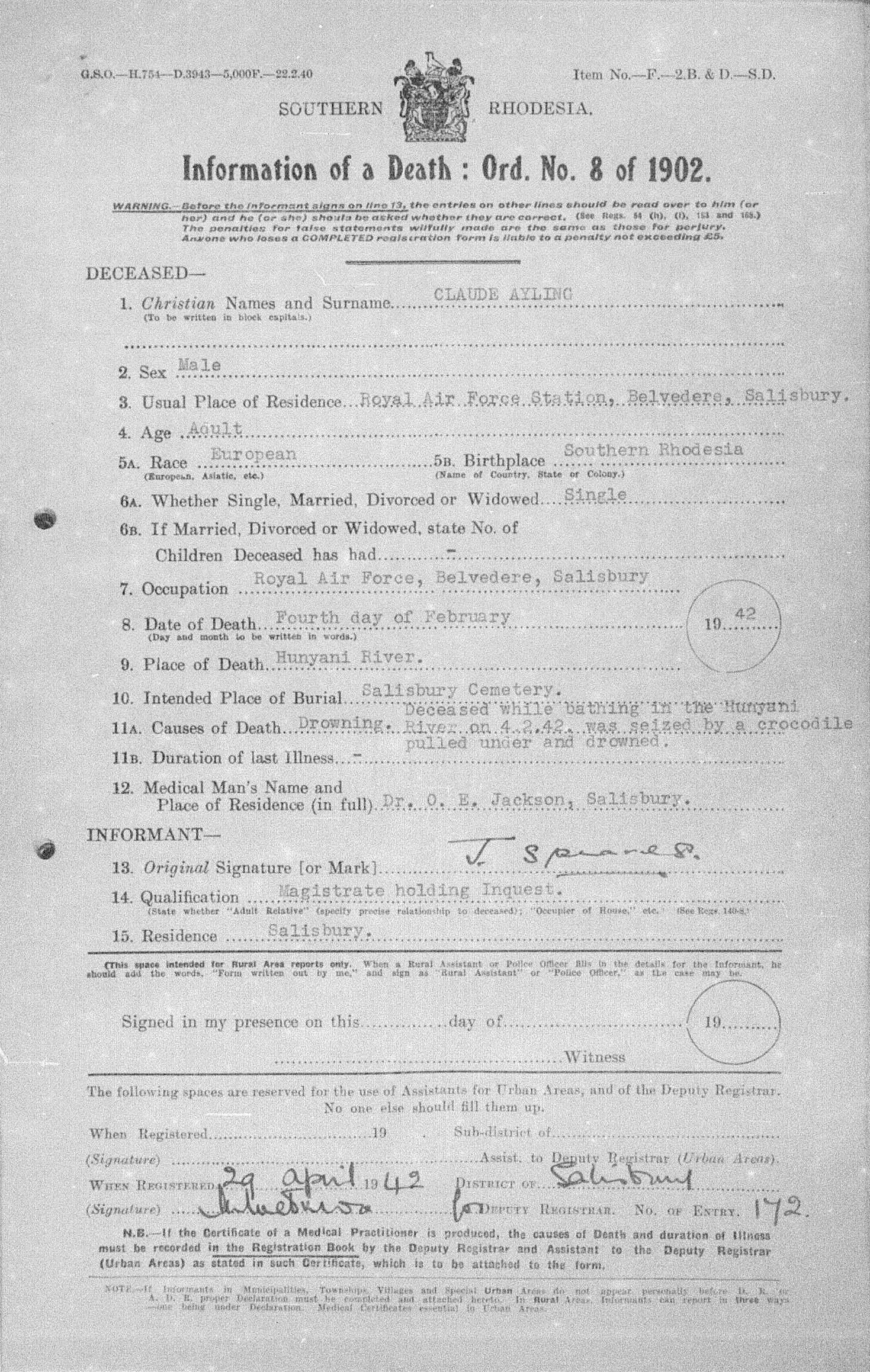 Drowned, seized by crocodile, pulled under water and drowned whilst bathing in the Hunyani River |