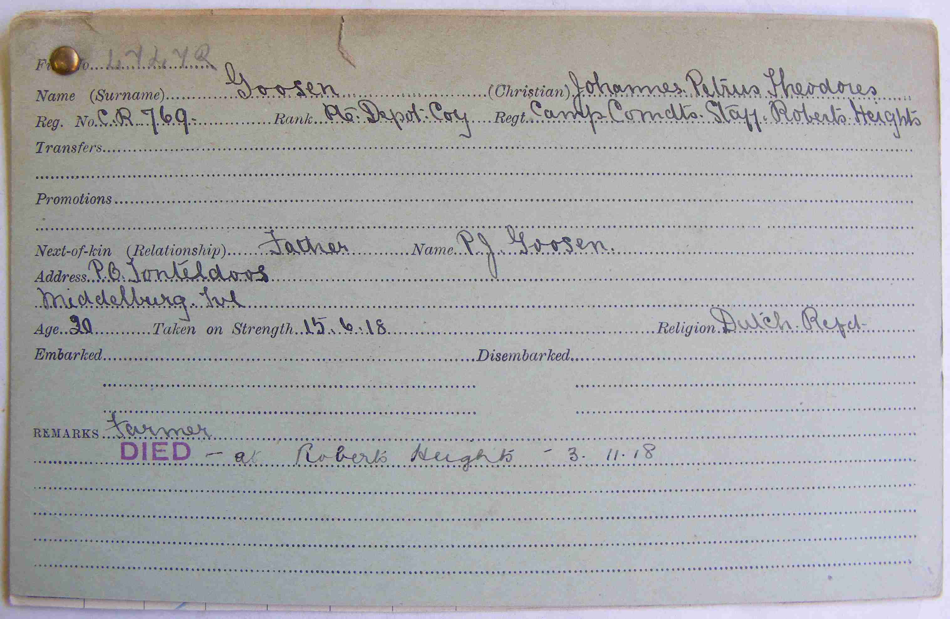 Son of Pieter Johannes and S. L. S. Goosen (nee Potgieter), of Boomplaas, Tonteldoos, Middelburg, Transvaal. |