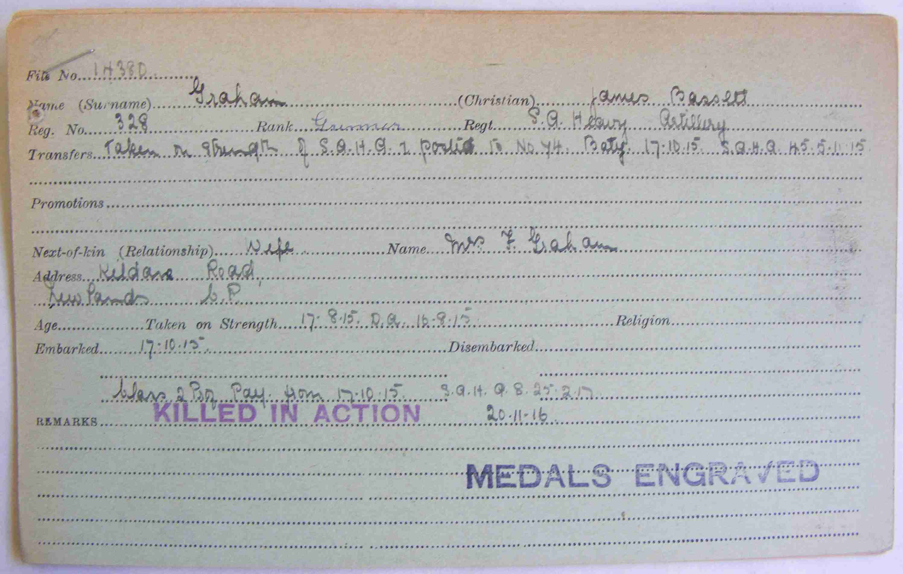 Killed in action. The Battery was at Colincamp since the 7th October 1916 in a position really untenable for a heavy battery, without cover and a favourite target for the German artillery. On the 20th November, the enemy kept up a severe bombardment all day, and four gunners were killed (the three men buried at Courcelles and Bombardier Frank Birt buried in Couin British Cemetery).