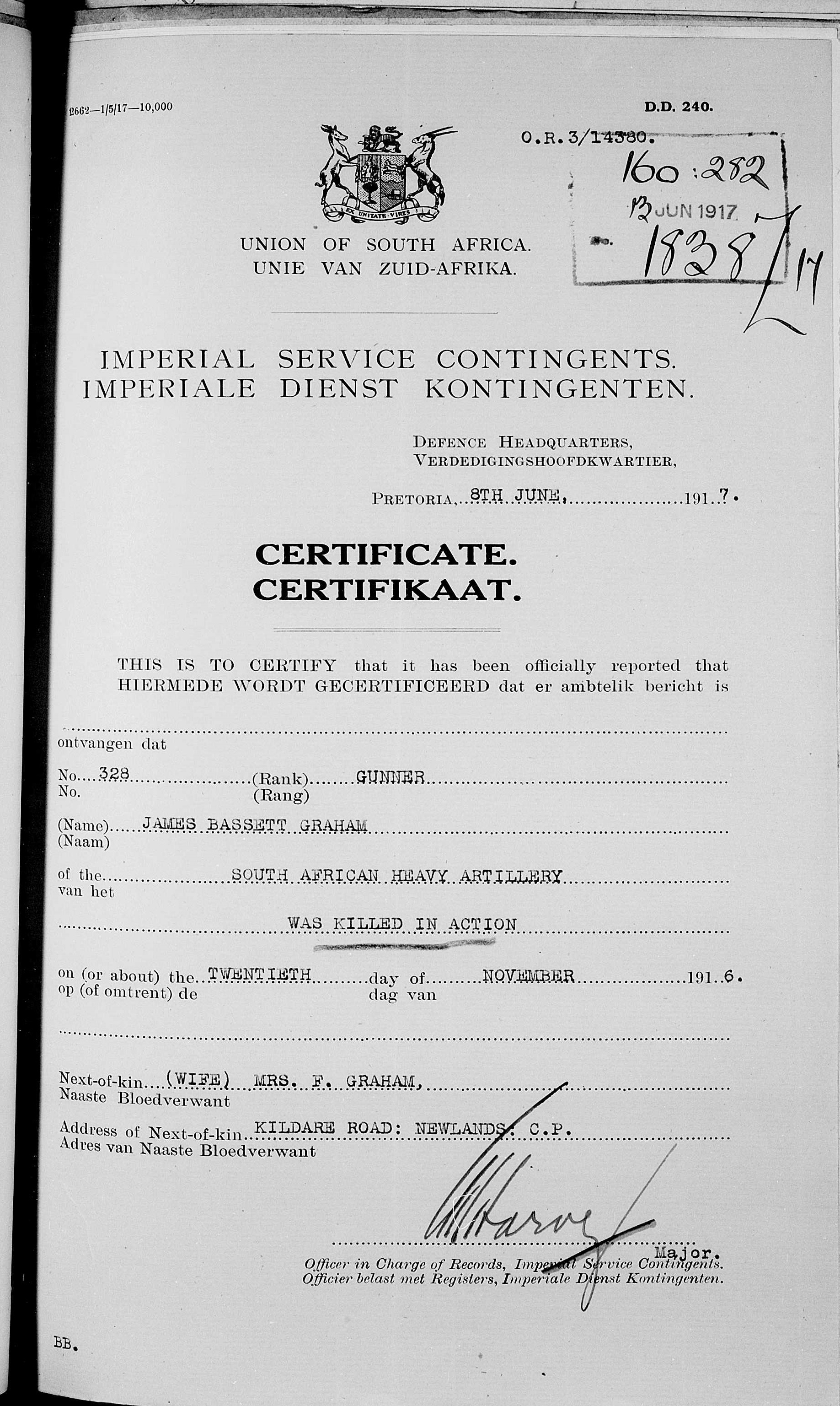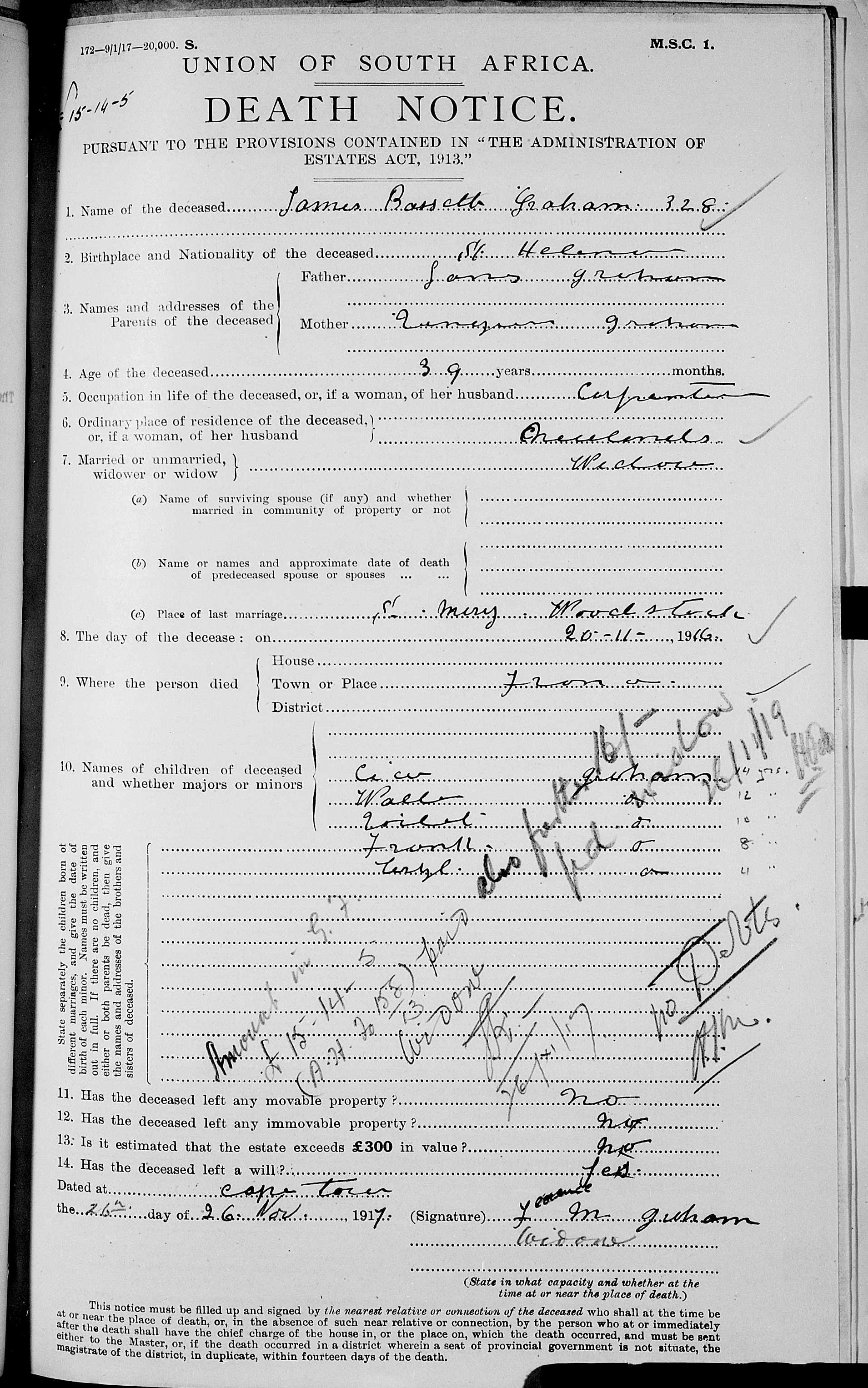 Son of James and Virginia Graham, late of St. Helena; husband of Mrs. F. M. Graham, of Main St., Newlands, Cape Province, South Africa. Born St. Helena. A carpenter.