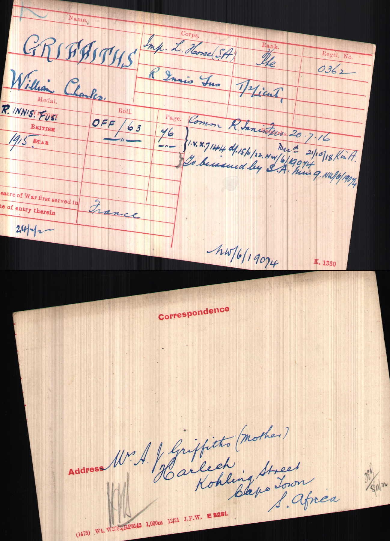 Son of Arthur John and Rose Griffiths, of "Harlech", Kohling St., Cape Town, South Africa. Born at Cardiff. Came from South Africa to enlist.