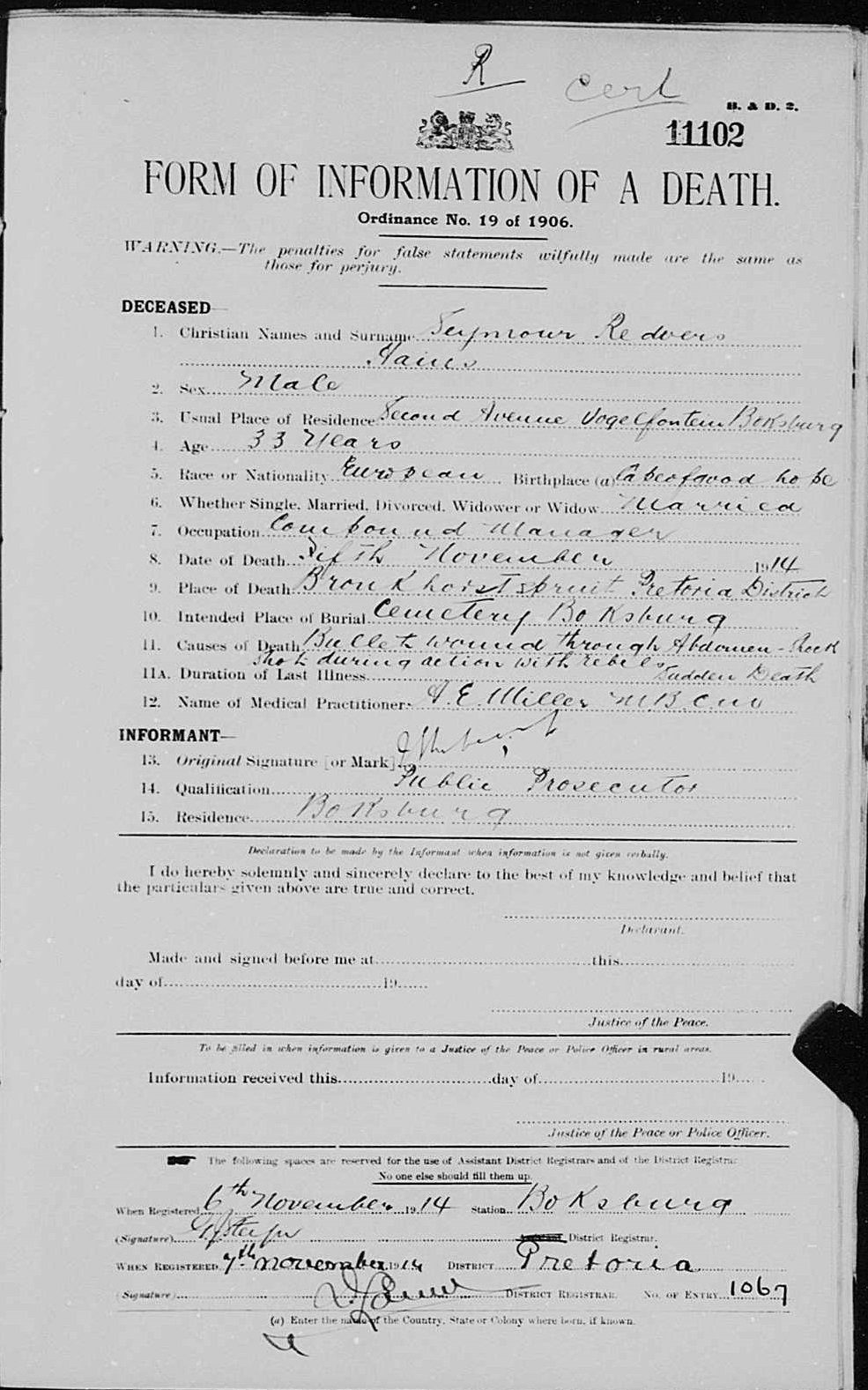 Killed in action, bullet wound through abdomen, at Silver Mine near Bronkhorstspruit