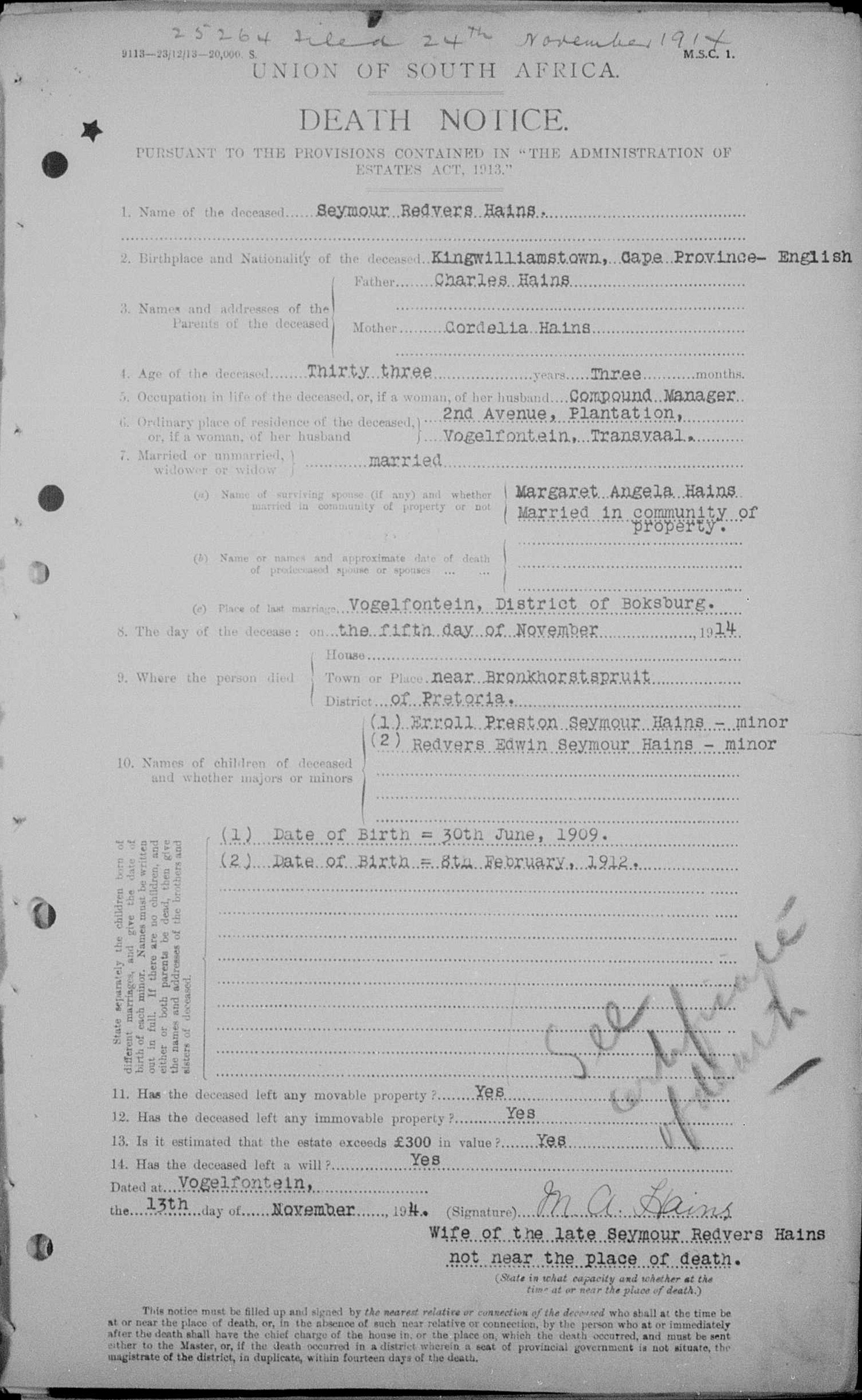 Son of Charles and Cordelia Hains. Husband of Margaret Angela Hains, of 24, 2nd Avenue, Boksburg. Born King William's Town. A compound manager.