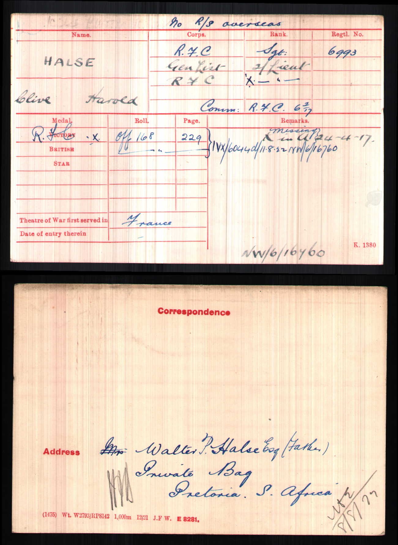 Son of Walter Poultney Halse and Letitia Alice Halse, of Pretoria, South Africa. Attended Kingswood College (Grahamstown) and Selborne College (East London). Originally buried in the German cemetery at Bantouzelle and then his body was moved to its current location. ref. South African Roll of Honour 1914-1918