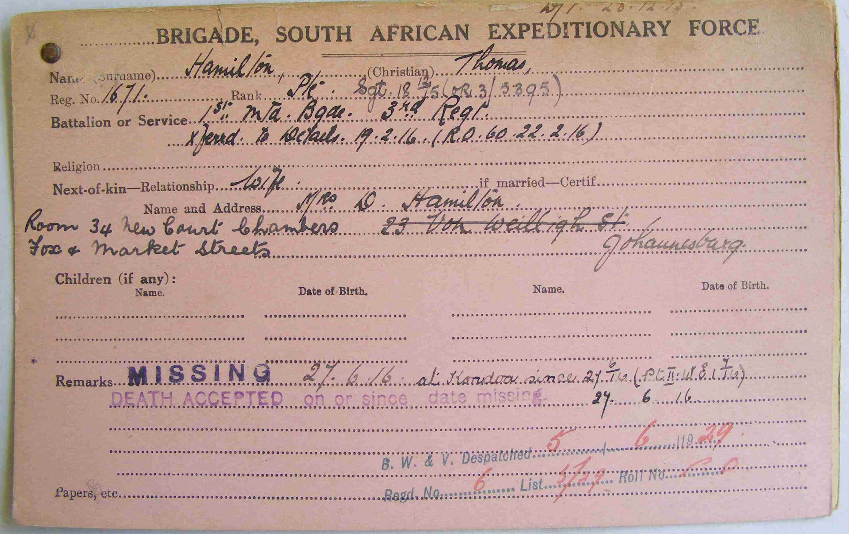 Husband of Dorothy Hamilton, of 23, Von Welligh Street, Johannesburg. Born Lancashire, England.