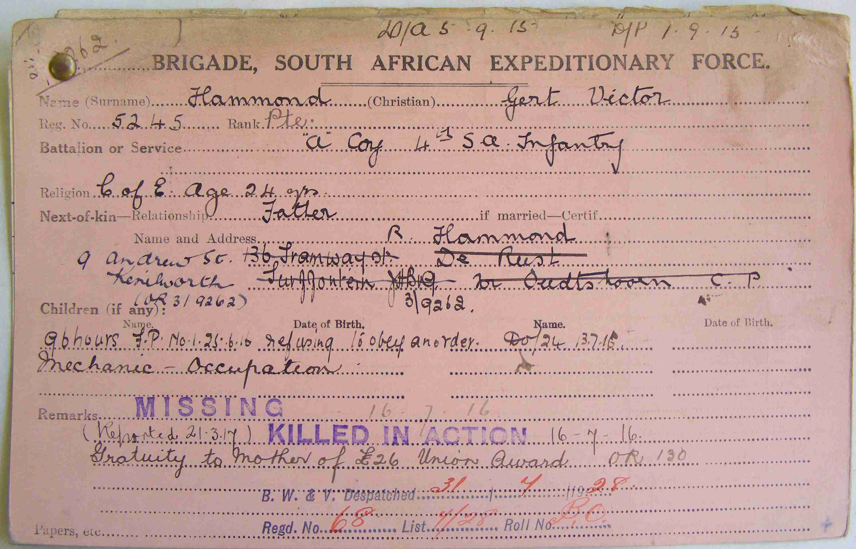 Son of Mr. R. Hammond, of 9 Andrew Street, Kenilworth |