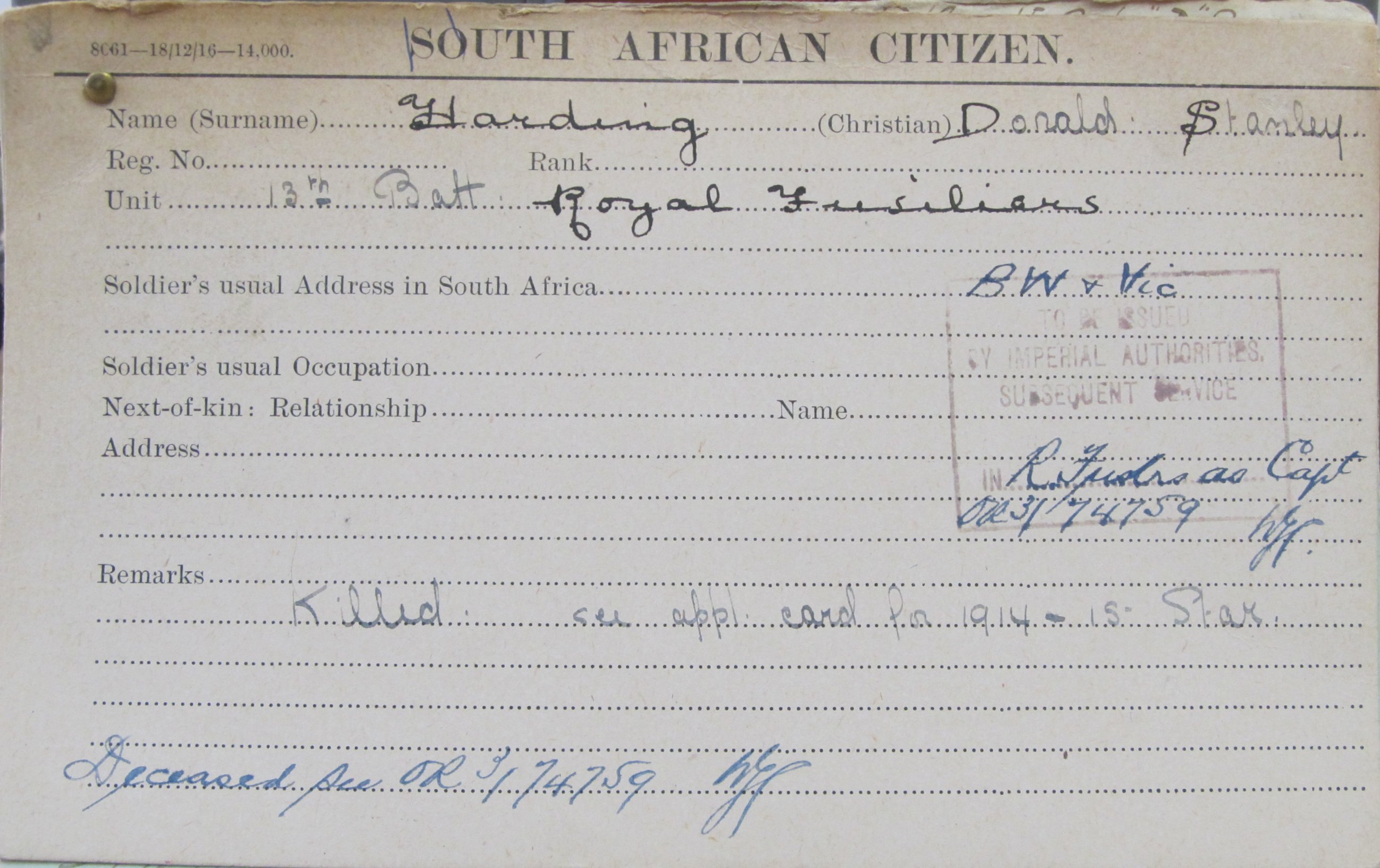 Son of Edward Jackson Harding and Clarance Catherine Harding, of Exeter. Also served in German West Africa in Natal Carabineers. Born at Norwich.