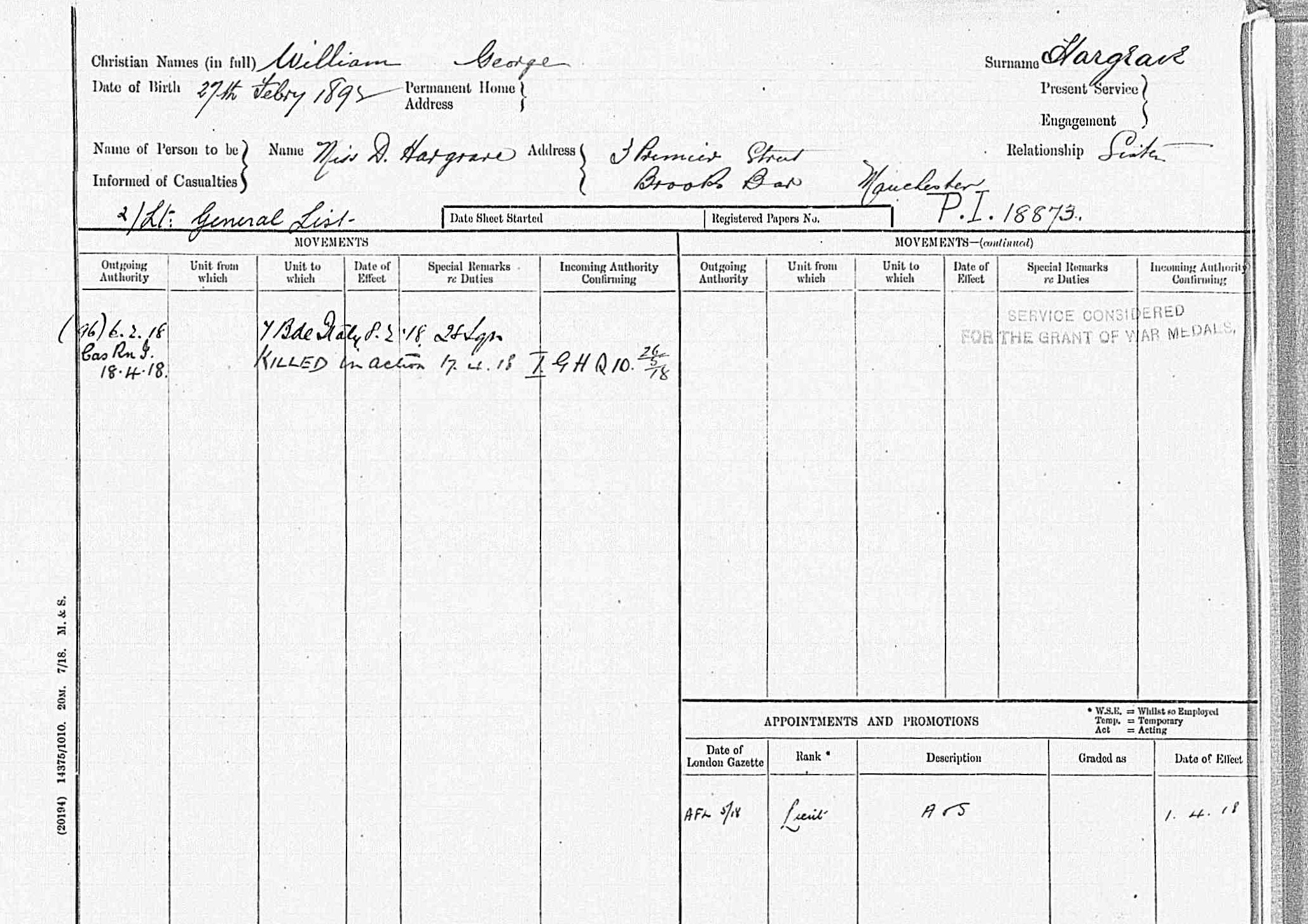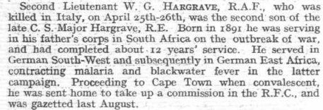 Son of T. E. Hargrave (C.S.M.) and Amy, his wife. Born Curragh Camp, County Kildare, Ireland. ref. South African Roll of Honour 1914-1918