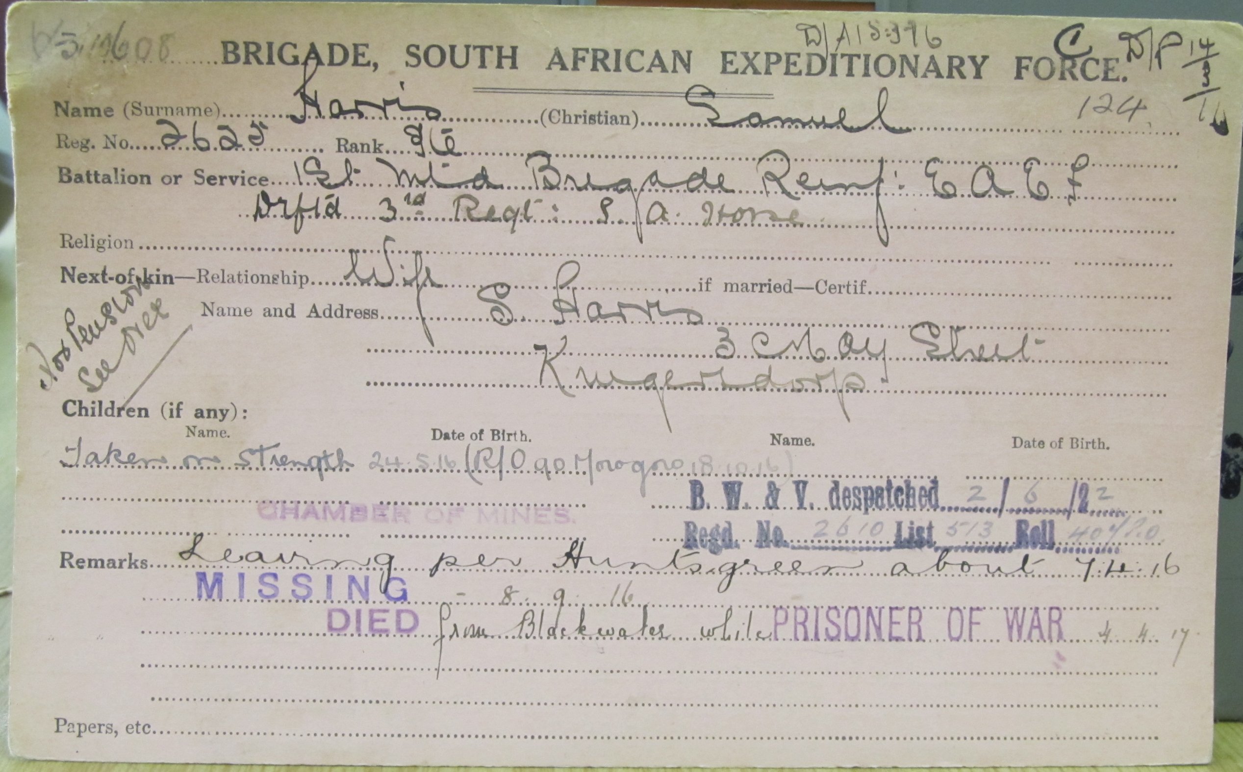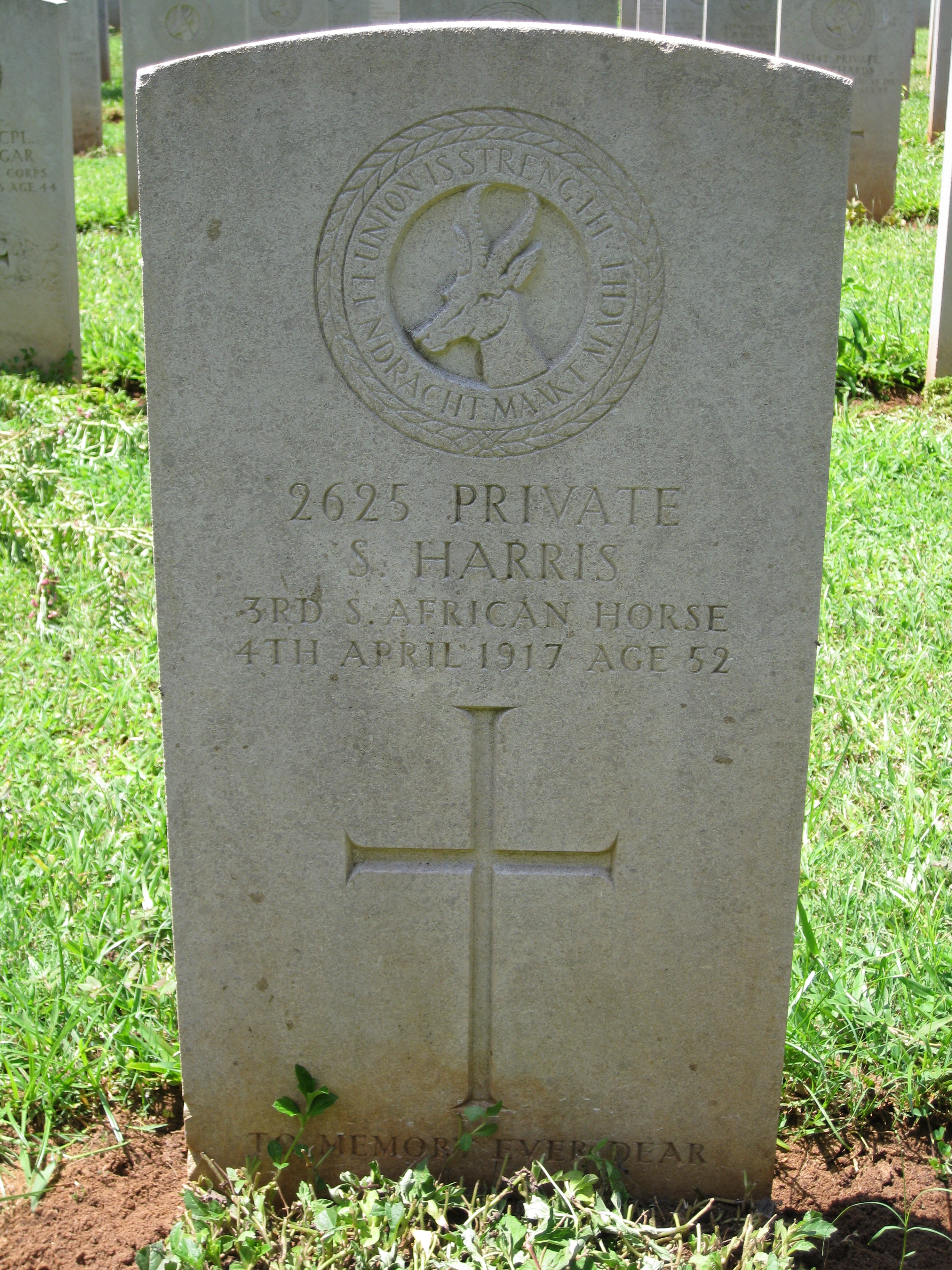 Son of Richard and Elizabeth Harris, of Redditch, England; husband of Annie Alexander Harris, of 13, May St., Krugersdorp, Transvaal, South Africa. On Maritzburg College cenotaph.