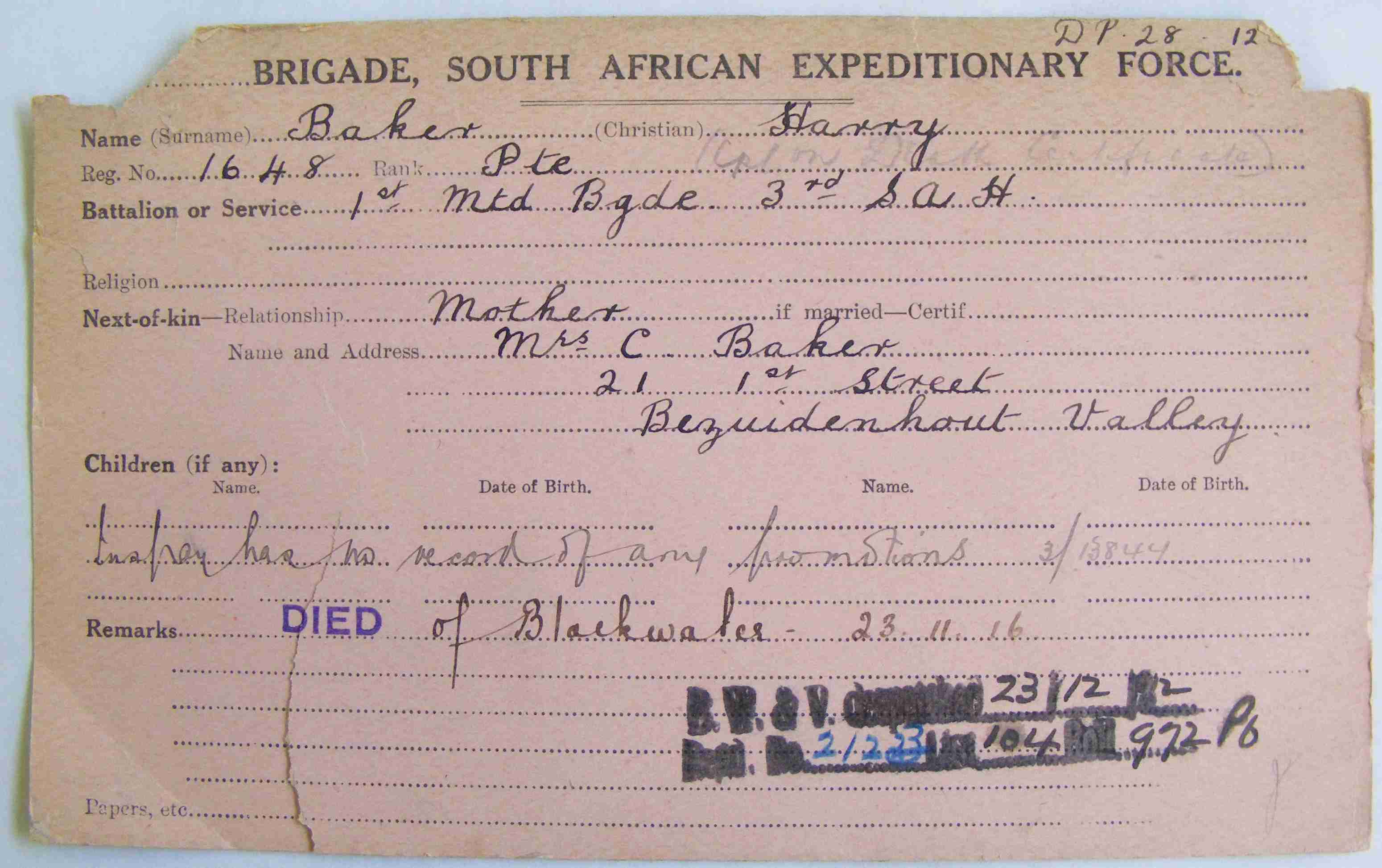 Son of Charles and Clara Baker, of 14B, Richmond Rd., Auckland Park, Johannesburg, South Africa. Born Birmingham, England. A butcher. On Bezuidenhout Valley War Memorial